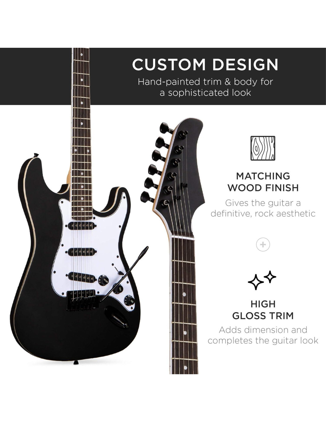 - KIT DE GUITARRA TODO EN UNO: No es necesario comprar accesorios adicionales, este conjunto completo viene con un amplificador y cable, un estuche de transporte de nylon, cuerdas extra, una pua, barra de trémolo y una correa con un soporte de pua adjunto