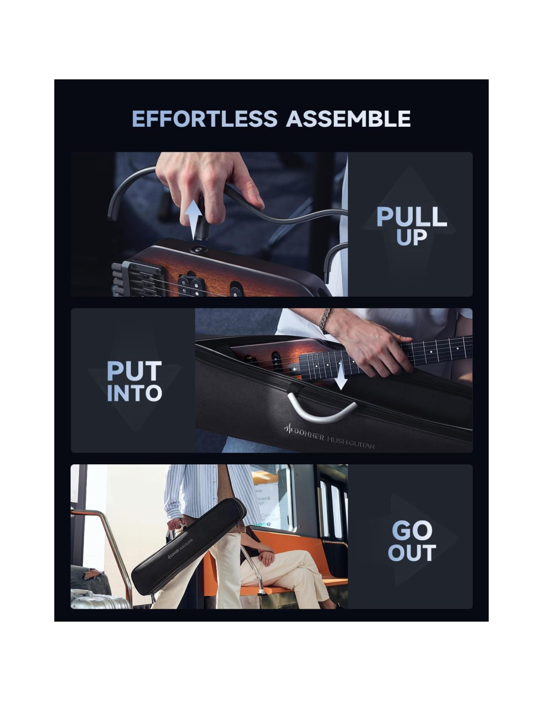 - Conectar y Jugar: La guitarra de práctica HUSH X ha mejorado sus soportes para un montaje más fácil. Nota: Asegúrate de que el soporte esté completamente insertado antes de usarlo o puede salirse
