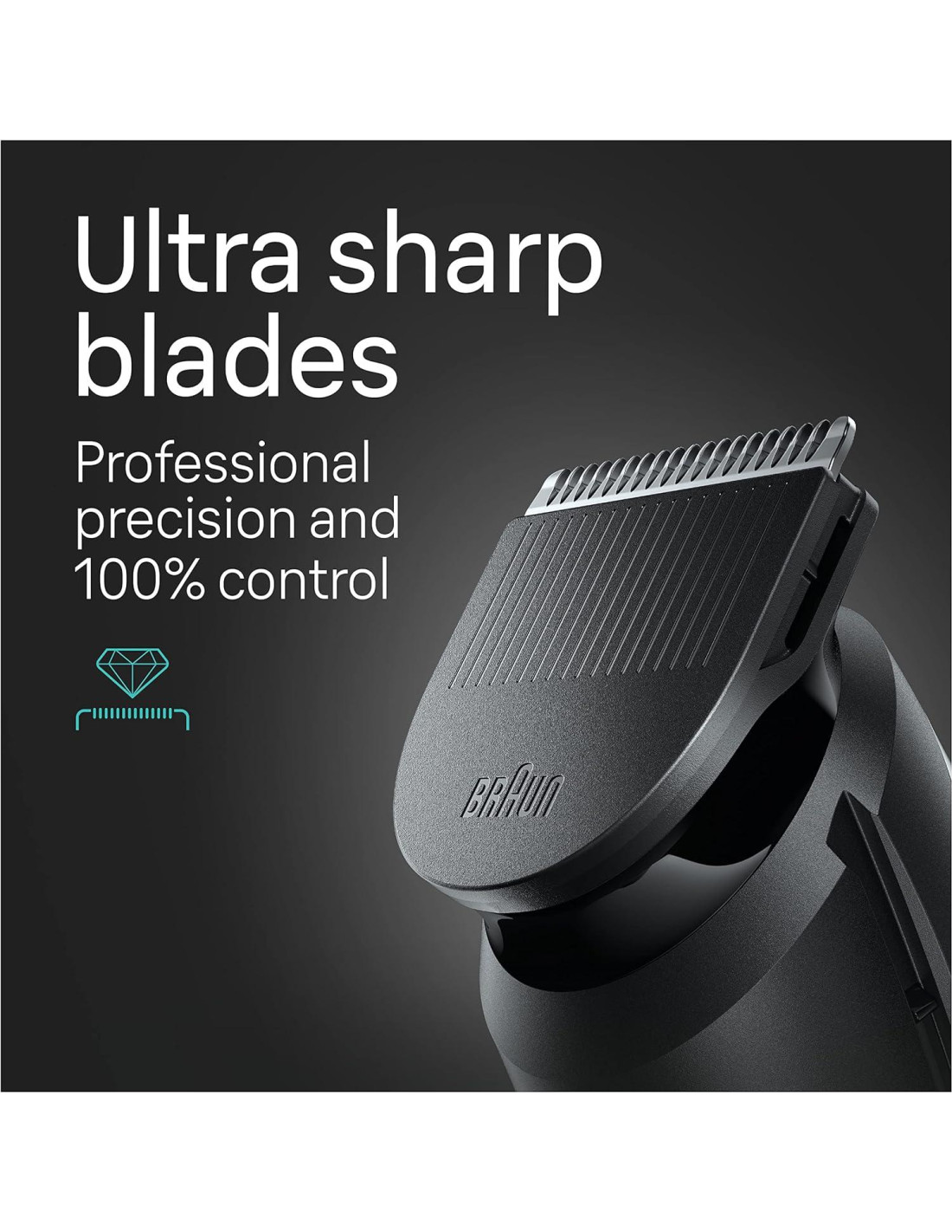 Kit de Estilo Todo-en-Uno Braun Serie 5. Para versatilidad y precisión en casa. Con una recortadora de barba, orejas y nariz, cortapelos y recortadora corporal. Presenta la Rueda de Precisión con 40 configuraciones de longitud y cuchillas ultra afiladas. 80 minutos de tiempo de funcionamiento inalámbrico. Incluye: Cabezal de recortadora de plástico, cabezal de recortadora corporal, peine de barba de precisión (0.5 mm - 10 mm) y peine de cabello (10.5 mm - 20 mm), peine para cejas, cabezal de recortadora de orejas y nariz, cabezal de recortadora de detalles, mini afeitadora de lámina, bolsa de viaje, bolsa con cremallera. Contenido de la caja 1x dispositivo recortador incl cabezal de recortadora de plástico 1x cabezal de recortadora corporal 1x peine de barba de precisión (0.5 mm - 10 mm) 1x peine de cabello de precisión (10.5 mm - 20 mm) 1x peine para cejas 1x cabezal de recortadora de orejas y nariz 1x cabezal de recortadora de detalles 1x mini afeitadora de lámina 1x cepillo de limpieza 1x bolsa de viaje 1x bolsa con cremallera.