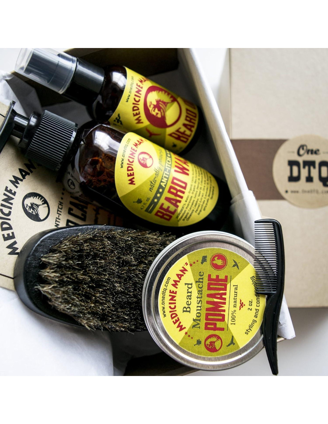 Kit de Cuidado de Barba Antipicazón de Medicine Man: Jabón para Barba, Aceite para Barba, Pomada para Barba y Bigote, Cepillo para Barba, Peine para Bigote - Aroma Terroso - Viene como una Caja de Regalo para el Cuidado de la Barba - ¡Haz feliz a un barbudo! Un kit muy masculino que es un gran regalo para un hombre con barba o un verdadero regalo para ti mismo. 100% Natural y Orgánico, estos productos son todas fórmulas originales de OneDTQ desarrolladas en nuestro taller de Brooklyn, NY. Se ha prestado especial atención a todos los detalles, desde los productos hasta el empaque, para garantizar una gran experiencia de regalo. JABÓN PARA BARBA ANTIPICAZÓN DE MEDICINE MAN Jabón para barba 100% natural y orgánico creado con conocimientos de curación natural del viejo mundo para ayudar a los hombres con barbas que pican de dos maneras diferentes. La primera es ayudarte a superar las primeras etapas de picazón al hacer crecer una barba. La segunda es ayudar a aquellos con picazón crónica en la barba, caspa de barba o enrojecimiento de la piel facial debajo de la barba. ACEITE PARA BARBA ANTIPICAZÓN DE MEDICINE MAN El mejor aceite para barba para controlar la picazón de la barba, la caspa de barba y las manchas rojas debajo de tu barba. Infundido con aceites esenciales de Romero y Lavanda, este aceite para barba de aroma terroso es estabilizante y calmante. Este aceite para barba ayuda al crecimiento de la barba y es un acondicionador natural y efectivo para cada hombre con barba que desea tener un vello facial saludable, completo y bien cuidado. POMADA PARA BARBA Y BIGOTE ANTIPICAZÓN DE MEDICINE MAN 100% Natural y Orgánico, Acondicionador sin Enjuague con fijación ligera. Contiene Aceite de Raíz de Bardana y Aceite de Semilla de Ricino para ayudar a aliviar la picazón de la barba, mejorar el crecimiento del cabello y combatir la caspa de barba. Se aplica sin esfuerzo al cabello y la piel y se absorbe rápidamente para un aspecto limpio, natural y ordenado. CEPILLO PARA BARBA DE CABELLO DE JABALÍ NATURAL Cepillo de estilo militar con mango de madera que se adapta perfectamente a la palma de su mano. Las cerdas son lo suficientemente cortas y suaves como para no arrancar sus vellos faciales, pero firmes para una gran experiencia de cepillado de barba. Úsalo seco o húmedo.