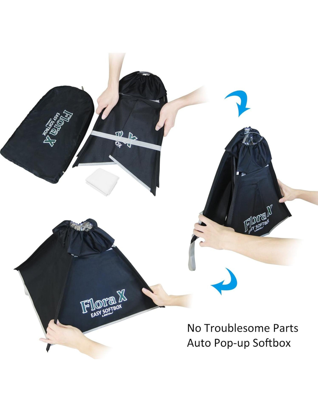 - (3) x Flora X Softbox: Configuración Rápida y Fácil ~ Gire en Sentido Horario para Bloquear; Gire en Sentido Antihorario para Desbloquear