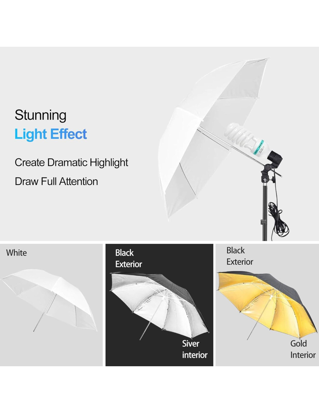 - [Paraguas Fotográfico Negro/Plata/Oro]: 2x paraguas 33" (0.84 m) Negro/Plata tienen dos funciones. Forro interior: Minimiza la pérdida de luz y maximiza la difusión de luz para contraste y aumentar los reflejos, refleja más luz que un paraguas translúcido o soft-box. Forro exterior: Negro para evitar que luces no deseadas se reflejen en su foto. 2x paraguas 33" (0.84 m) Negro/Oro reducen la temperatura de color de la luz de flash adecuadamente.