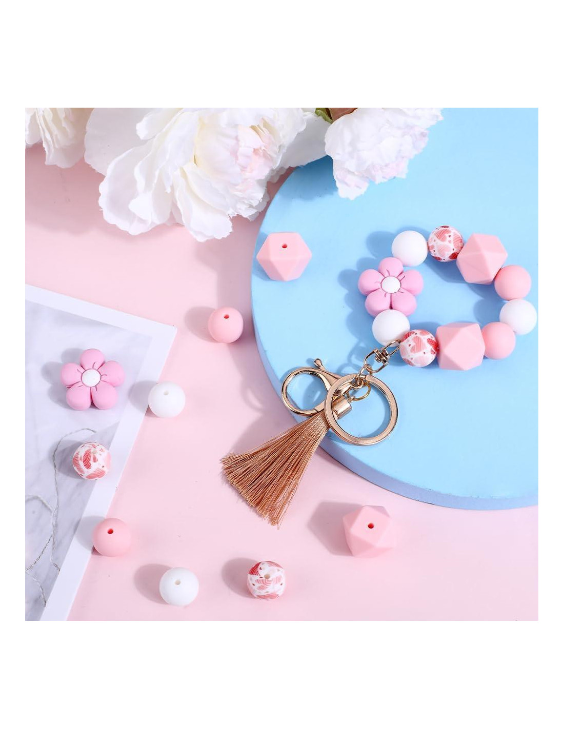 - [PERLAS DE FLORES DE SILICONA]: Las perlas de silicona de estilo floral y temática rosa son exquisitas y hermosas, llenas de sentimientos de ensueño y cuentos de hadas, lo que las hace perfectas para hacer llaveros que puedas llevar contigo.