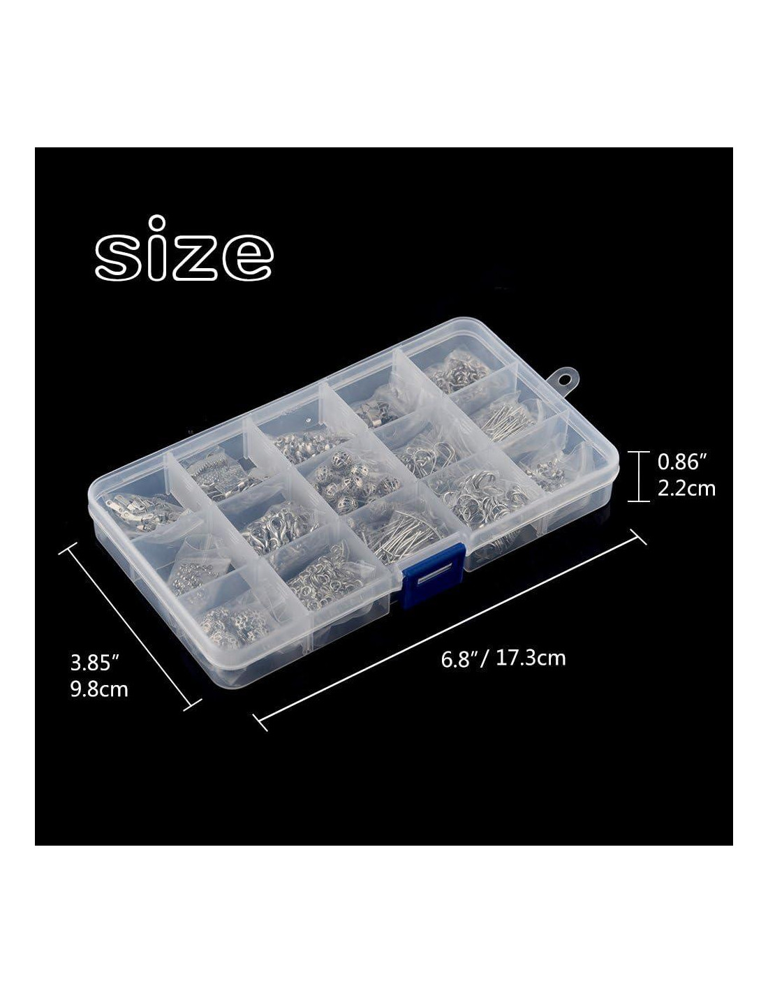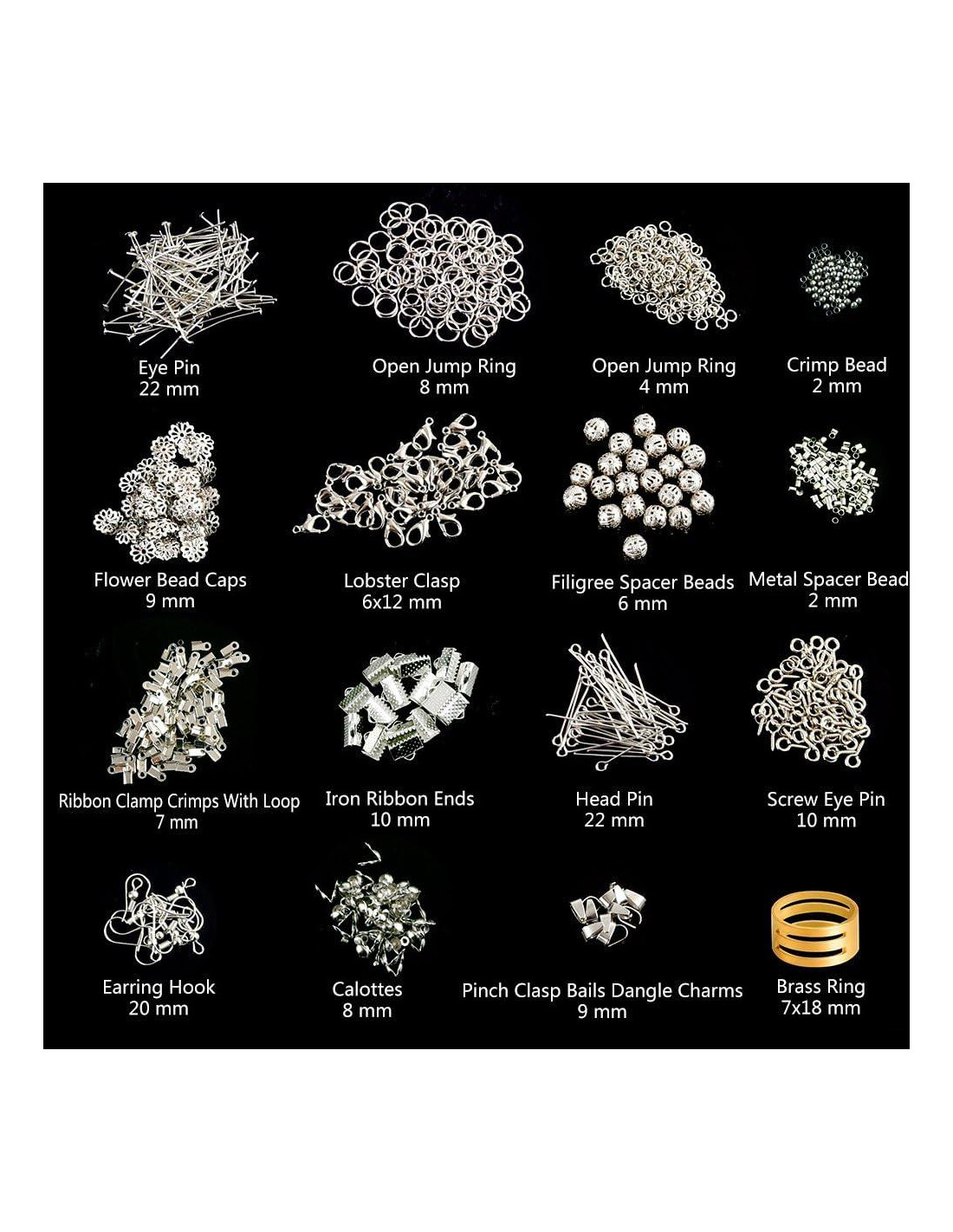 - El kit de componentes para joyas incluye: anillos de salto abiertos de 4 mm / 8 mm, cierre de langosta de 7 x 12 mm, alfileres de cabeza de 26 mm, alfileres de ojo de tornillo de 10 mm, cuentas de crimpado de 2 mm, ganchos para aretes de 20 mm, extremos de cinta de hierro de 10 mm, abrazaderas de cinta de 8 mm con bucle, colgantes de pinza de 6 mm, anillos de latón, tapas de cuentas de flor de 9 mm, alfileres de cabeza de 25 mm, cuentas de 2 mm, cuentas espaciadoras de metal de 2 mm, cuentas espaciadoras de 8 mm