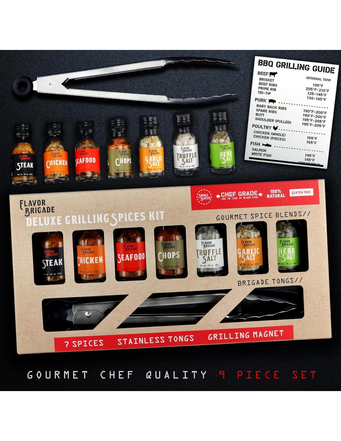 - Listo para Regalar: Incluye 9 artículos, Mezclas de Especias, Sales Saborizadas, Frotaciones, Pinza de Acero Inoxidable de 9 pulgadas (22.86 cm), Imán de Temperatura/Tiempo de Parrilla, Caja de Regalo.