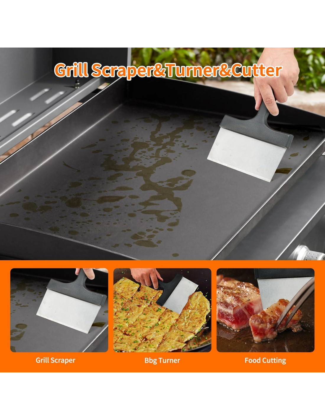 - [Raspador de plancha multifuncional] Este raspador de parrilla está hecho de acero inoxidable para raspar rápida y fácilmente los restos de la sartén. Este accesorio para plancha es perfecto para restaurantes, camiones de comida, bares y parrillas de plancha, barbacoa al aire libre. Los volteadores de parrilla también ayudan a voltear la comida.
