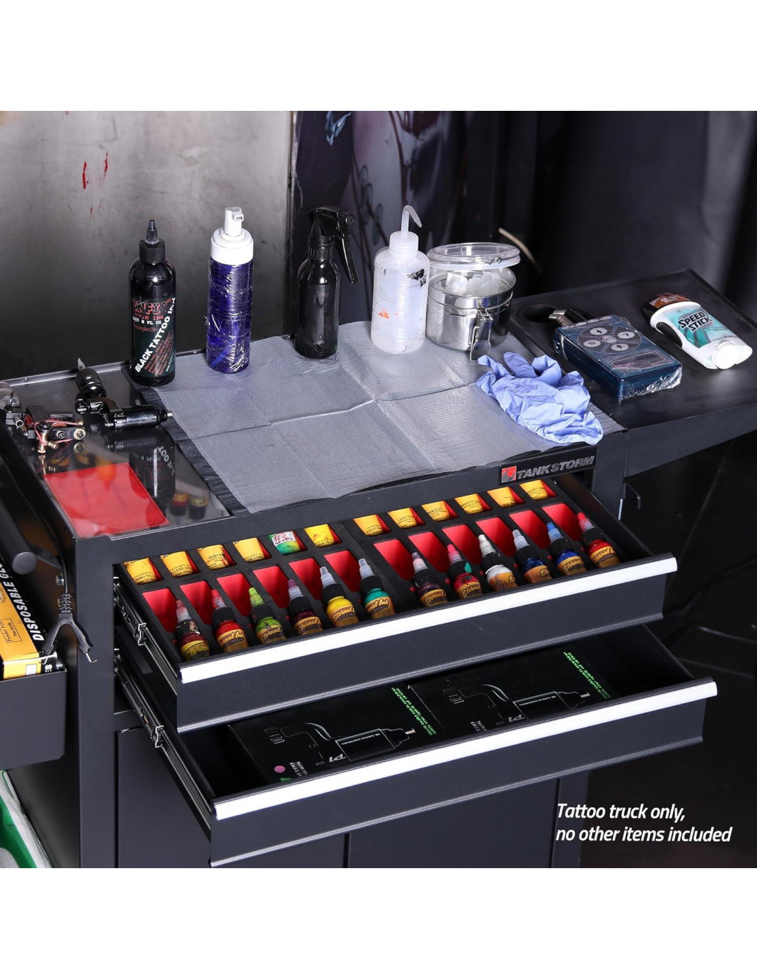 - Suficiente Espacio de Almacenamiento Los dos cajones superiores funcionan como almacenamiento de tintas para tatuajes