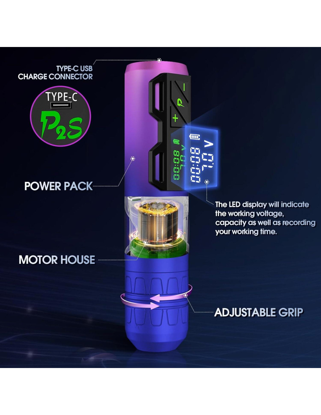- [Pluma de Tatuaje Inalámbrica Portex 2S] En lugar de una máquina de tatuaje de estilo pluma tradicional, la EZTAT2 Portex Generación 2S (P2S) aisló el uso de cable de tatuaje para proporcionar libertad al tatuar en cualquier lugar y de cualquier manera que desees, una experiencia de tatuaje satisfactoria compuesta por un motor personalizado EZ de mejor clase con sistema de accionamiento directo. 2 modos de operación, que pueden ajustar el voltaje rápida o lentamente, lo que no solo es conveniente, sino también fácil de operar y usar, creando así un tatuaje perfecto.
