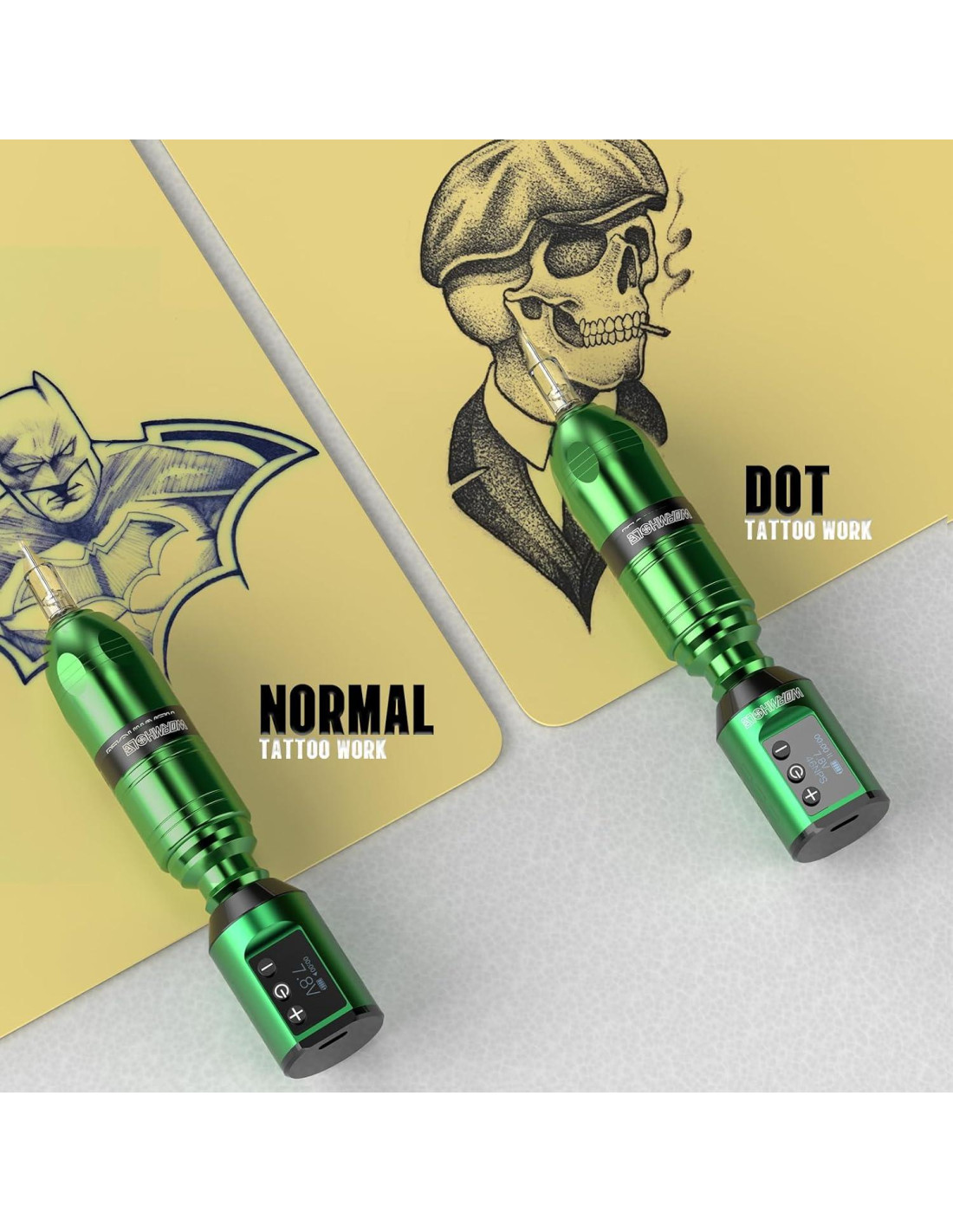 - Último Diseño - Esta batería de tatuaje inalámbrica permite a los artistas del tatuaje crear obras de arte basadas en puntos; Y tiene 60 niveles para que ajustes; Integrando el modo normal y el modo de puntos en una sola fuente de alimentación de tatuaje inalámbrica, desatando tu creatividad y mejorando la eficiencia; Y esta fuente de alimentación viene con una función de temporizador; Puedes saber cuántos minutos te tomó hacer un tatuaje; Para los artistas del tatuaje, esta característica les permite saber cuánto tiempo han invertido y cuánto retorno deberían recibir