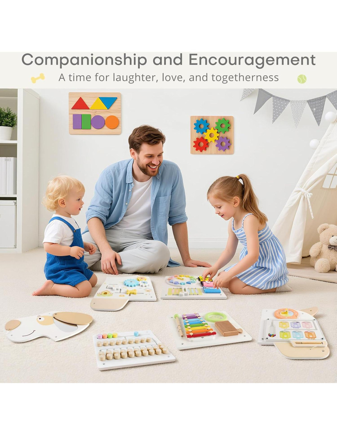- Vínculo entre Padres e Hijos. Perfecto para montar en las habitaciones o salas de juegos de los niños, los padres pueden unirse en cualquier momento para jugar y aprender juntos. Cada sección también se puede desmontar y usar por separado, por lo que los niños pueden llevar su panel de actividad Montessori favorito en viajes familiares.