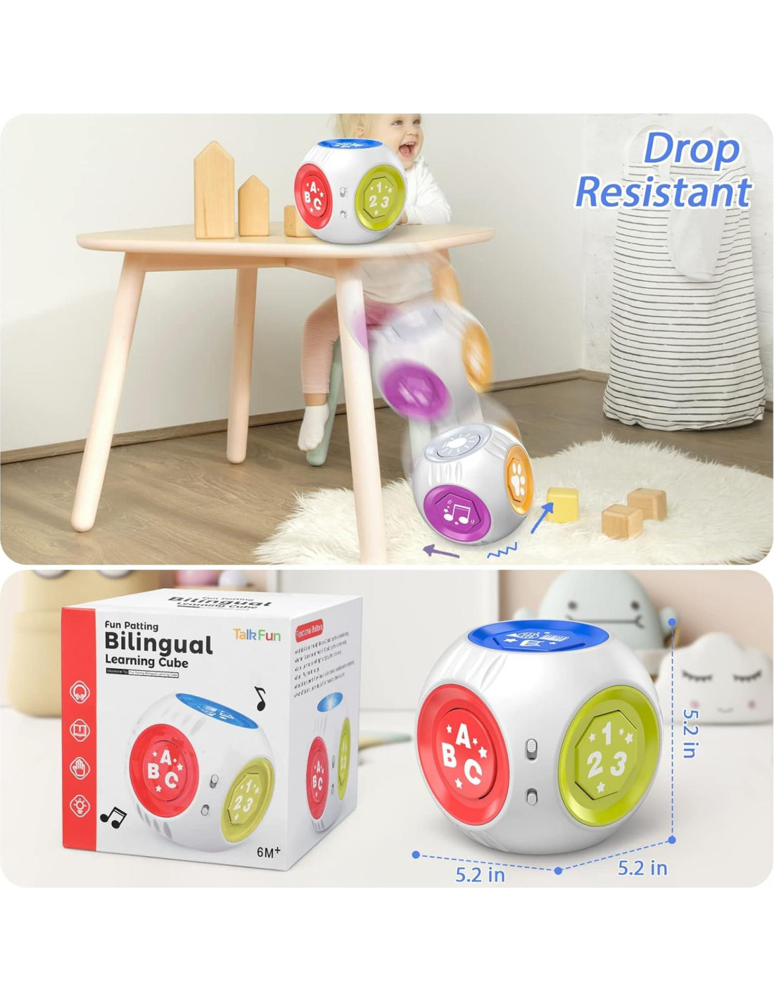 Talkfun fue fundada por una pareja con 3 hijos, están comprometidos a proporcionar productos seguros, de alta calidad y asequibles para padres e hijos. Hacemos de regla que todos los productos deben pasar pruebas de seguridad profesionales y ensayos de consumidores objetivo antes de ser lanzados al mercado. Elección perfecta para familias bilingües o quienes quieren exponer a los bebés al español. 2 niveles de volumen, no te preocupes por el ruido o que no sea lo suficientemente alto. El botón es grande y sensible, fácil de presionar para manos pequeñas. Hecho de ABS, resistente a caídas, no tóxico, libre de BPA. Se requieren 3 baterías AAA (no incluidas). Cubo de Aprendizaje Bilingüe Juguetes Musicales de Vaca Juguete Montessori para Bebés Juguetes de Vaca para Bebés