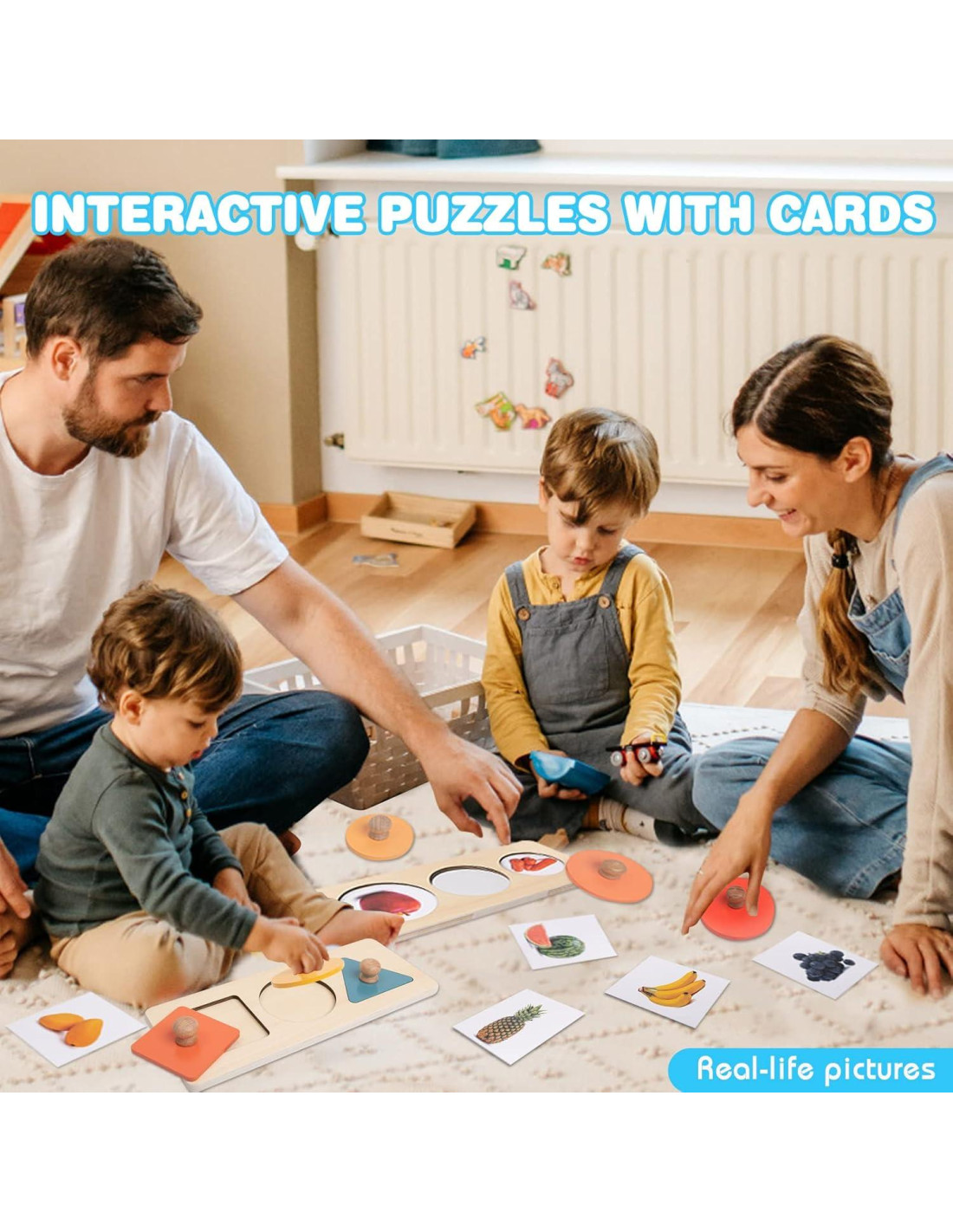 - Rompecabezas con Perillas Peekaboo con Tarjetas Múltiples formas geométricas y círculos de diferentes tamaños ayudan a su bebé o niño pequeño en el reconocimiento de tamaño, color y forma. Este conjunto de rompecabezas de madera viene con tarjetas de frutas y verduras de la vida real, que se pueden insertar en la tabla con los tres círculos (nota: las tarjetas no se pueden insertar en la otra tabla, lo cual es intencional), ayudando a su pequeño a emparejar artículos reales con imágenes de tarjetas. También puede imprimir sus propias fotos e insertarlas en la tabla. ¡Disfruta!