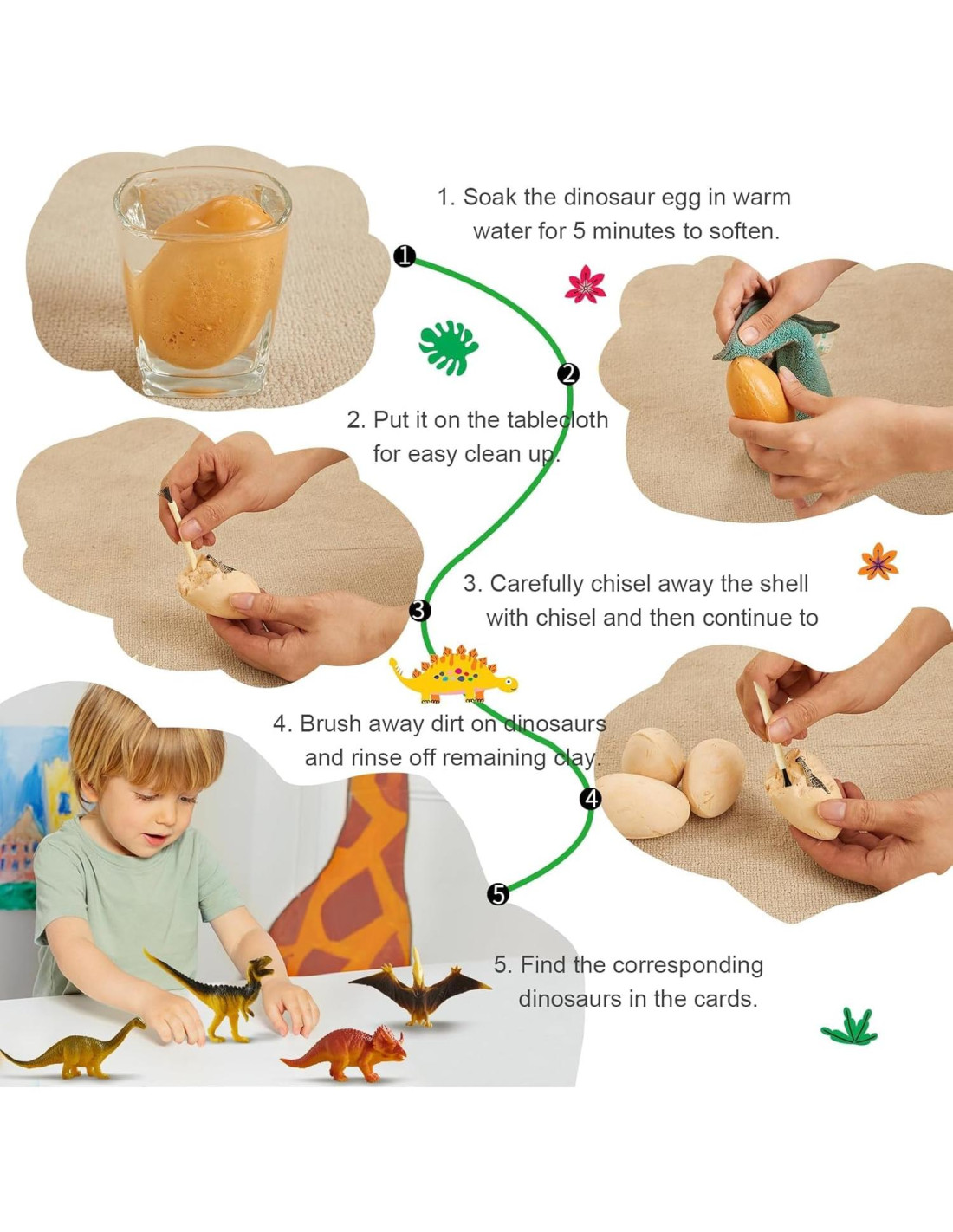- [DESCUBRIMIENTO DE DINOSAURIOS] Los niños podrían excavar diferentes pequeños dinosaurios de los huevos con herramientas de excavación, lo que se siente como un verdadero paleontólogo excavando únicos juguetes de dinosaurios. ¡Deja que los niños experimenten la diversión de los arqueólogos y descubran los dinosaurios extintos!