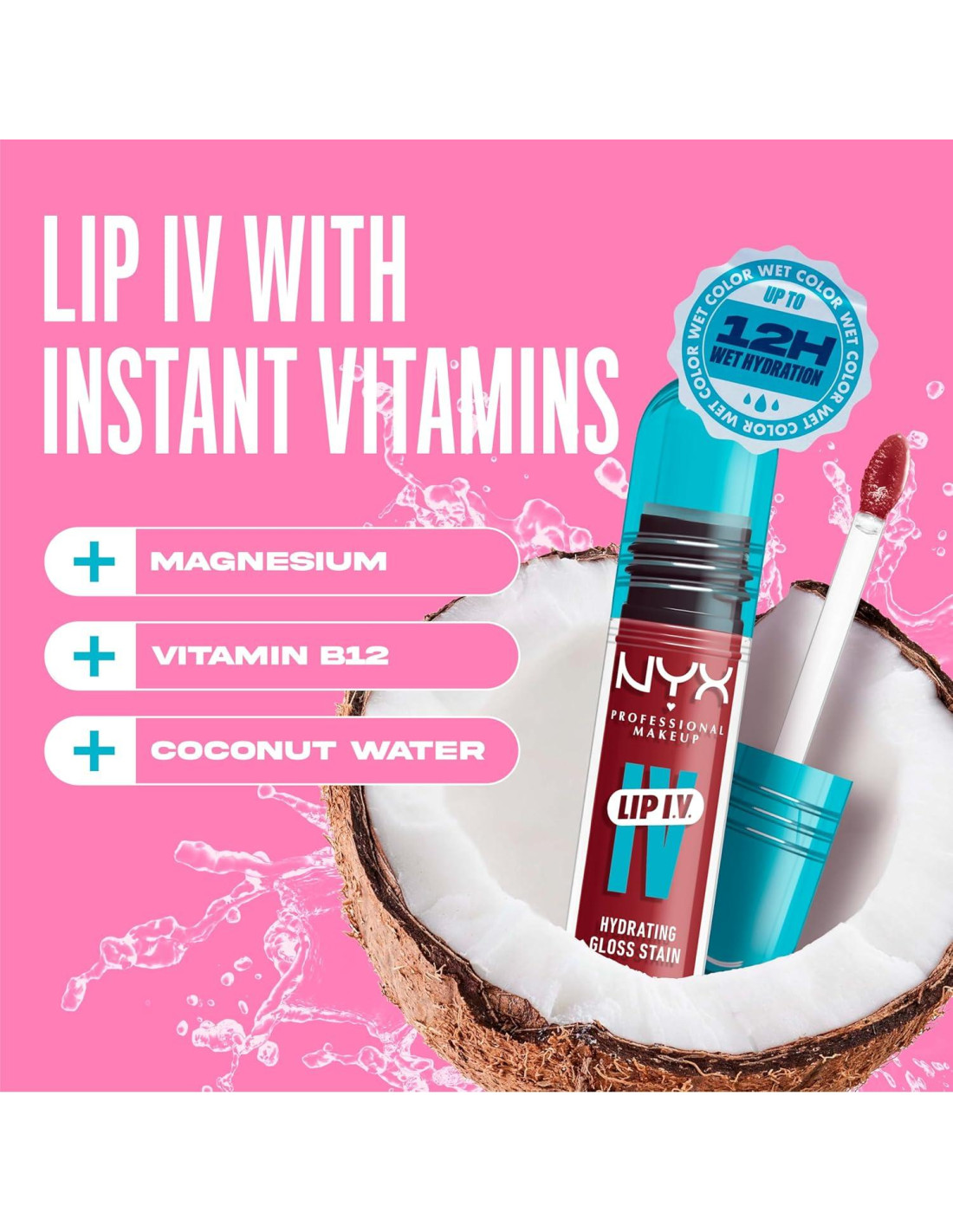 ¡Más húmedo es mejor! ¡Es Lip IV! Tinte de brillo hidratante. Brillo húmedo instantáneo. Tinte labial a lo largo del tiempo. En 16 tonos saturados. ¡Salpícalo! Color brillante de vitamina instantánea con un efecto único de tinte labial. Infundido con Magnesio, Vitamina B12 y agua de Coco que sacia los labios. Lip IV está diseñado con tecnología de ruptura de agua para pigmentos intensos ligeros y una sensación sensorial única que refresca los labios. Úsalo para un color brillante húmedo instantáneo que deja un tinte labial natural y uniforme. Desde un natural sutil hasta un toque de color vibrante, hay un tinte brillante para cada look.