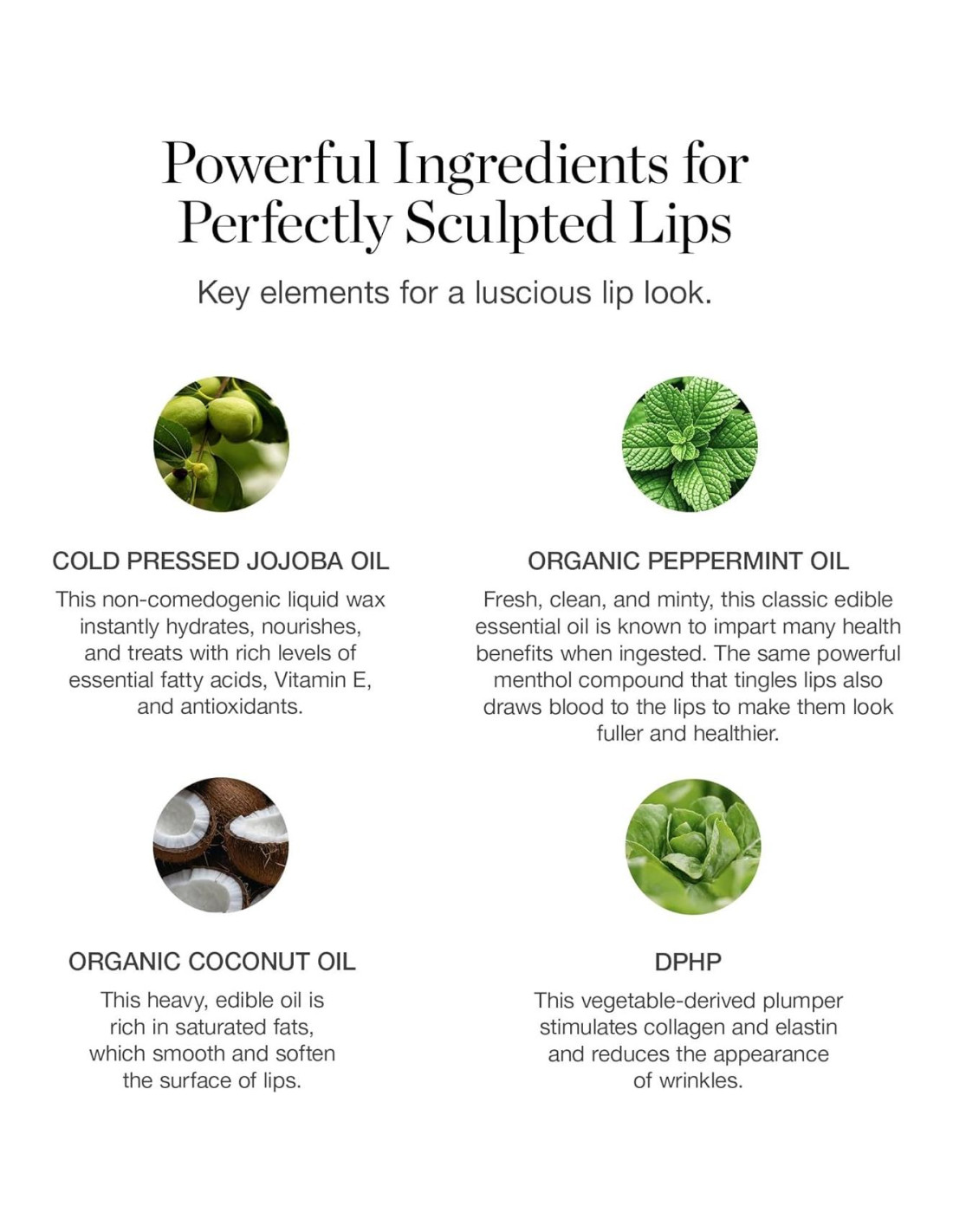 - PLUMP & PERFECT: Un bálsamo labial teñido que perfecciona el puchero, mejorado con ácido hialurónico hidratante y aceite esencial de menta refrescante para calmar.