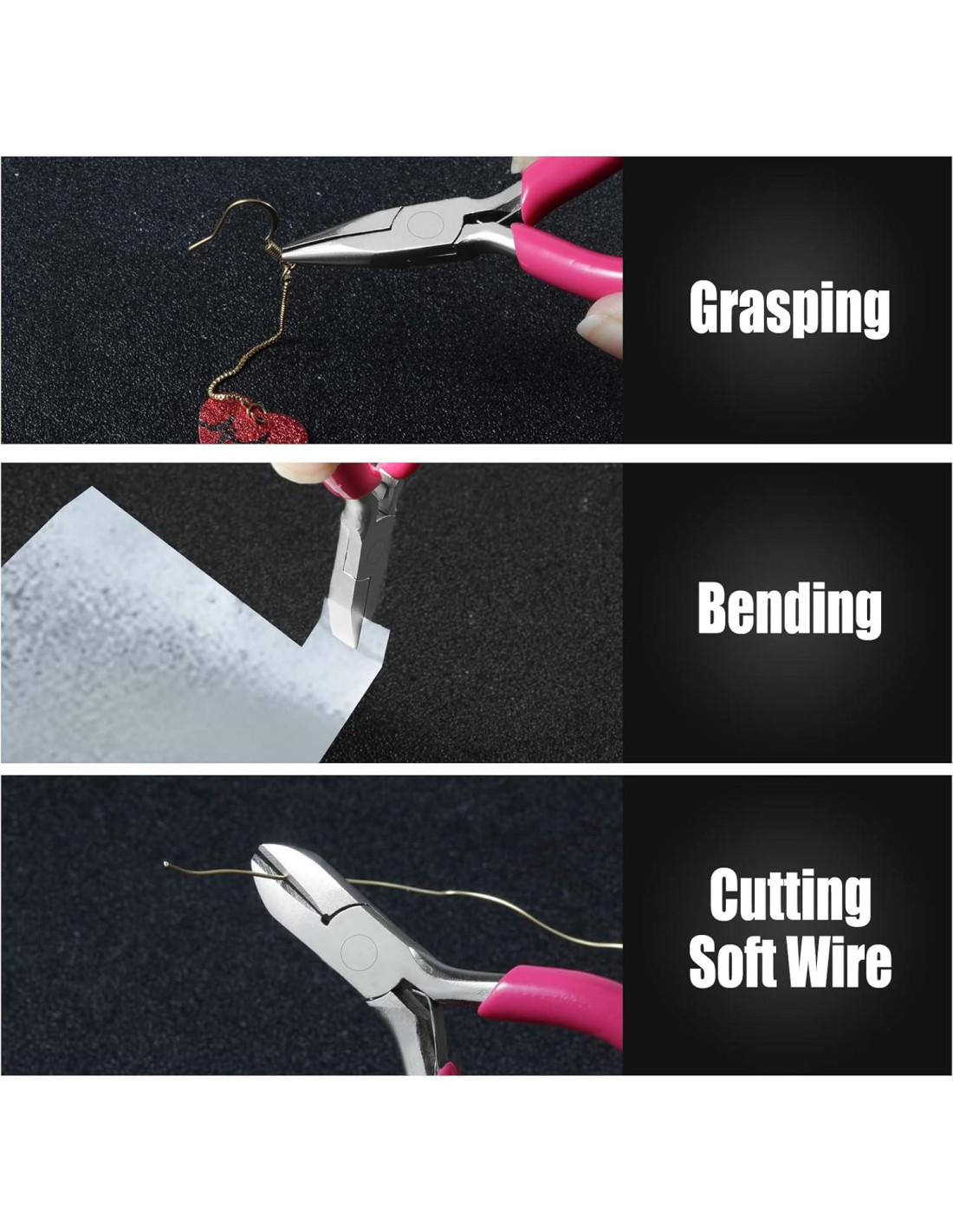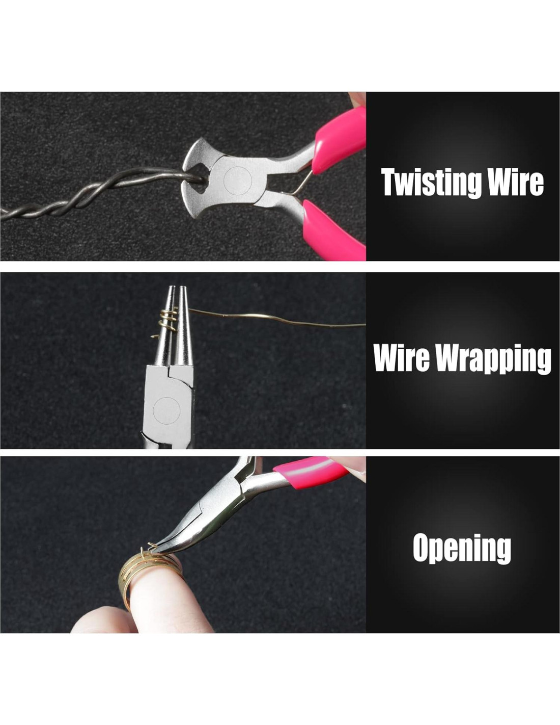 - Amplia Aplicación: Los alicates son muy adecuados para la fabricación de joyas, reparación de joyas, enrollado y otros trabajos manuales. El abre anillas es perfecto para abrir y cerrar el anillo de salto. Estas pinzas son perfectas para la reparación de relojes, manualidades, joyas, electrónica, etc.