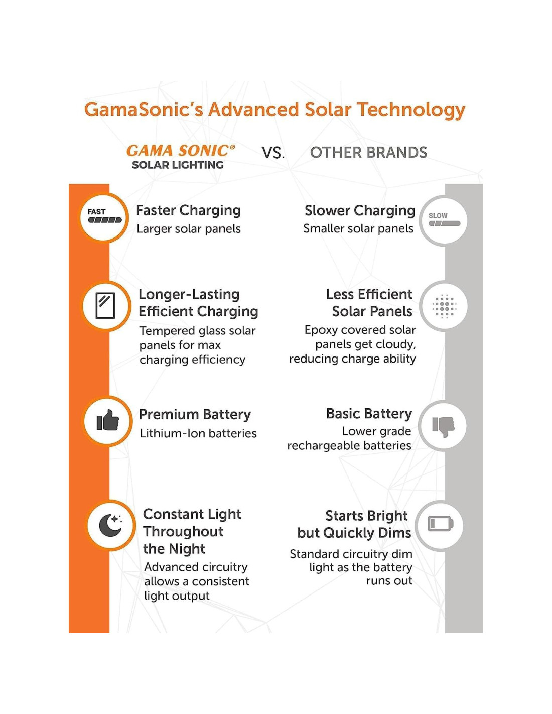 - CARGA MÁS RÁPIDA, DURACIÓN MÁS LARGA. Cuenta con paneles solares de vidrio monocristalino integrados de 7.2W para una carga más rápida y una batería de 3.2V Li-ion, asegurando hasta dos noches de iluminación cuando está completamente cargada con 6 horas de luz solar directa.