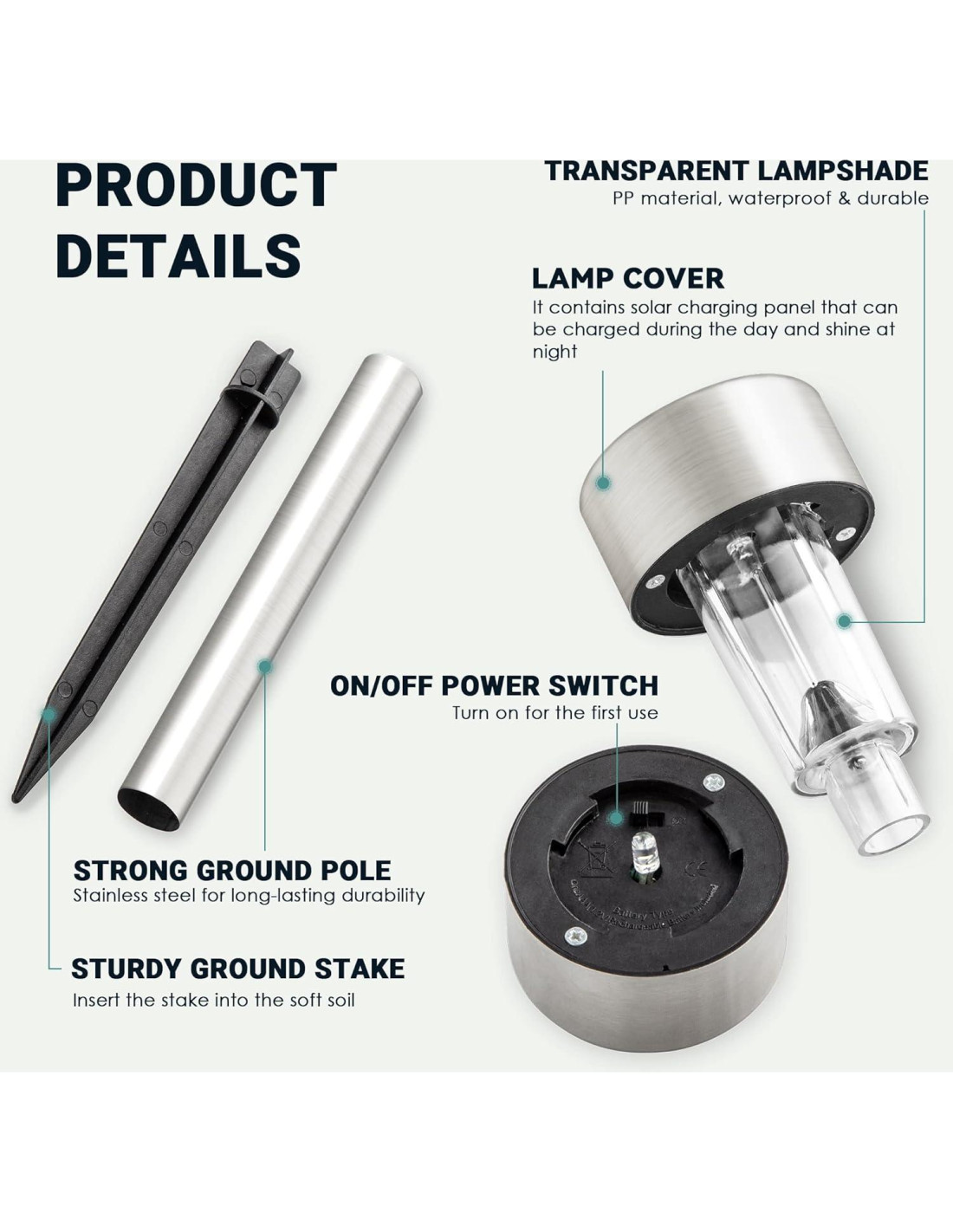 - FÁCIL DE INSTALAR Retira la pestaña de aislamiento debajo de la tapa y empuja la estaca en el suelo. Las luces del camino del paisaje se encienden automáticamente por la noche y se apagan al amanecer.