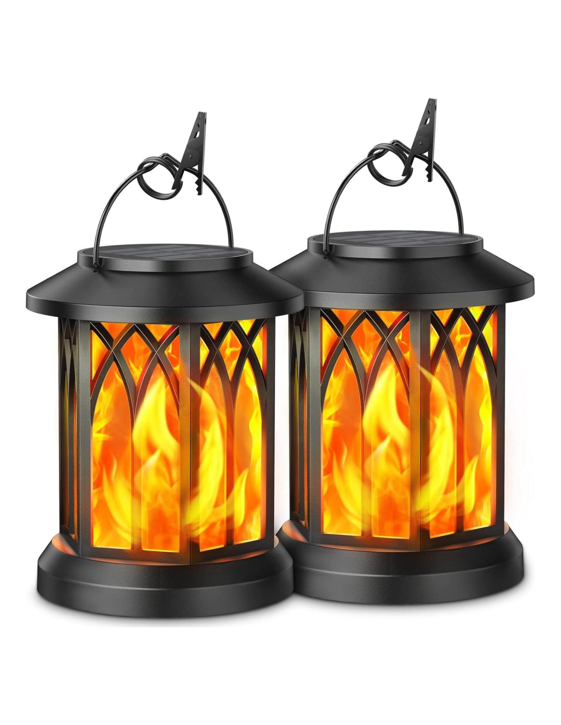 - [Amplia Aplicación y Regalo Ideal] Las luces solares colgantes exteriores impermeables se pueden colgar en porches, árboles, pérgolas, ramas con el anillo colgante o descansar sobre una mesa o repisa. Agregue una atmósfera cálida y agradable a su patio. El efecto de llama parpadeante de las luces solares colgantes hace que su área de hogar sea más animada y también son regalos ideales para mujeres, seres queridos, Día de la Madre, inauguraciones de casas y jardinería.