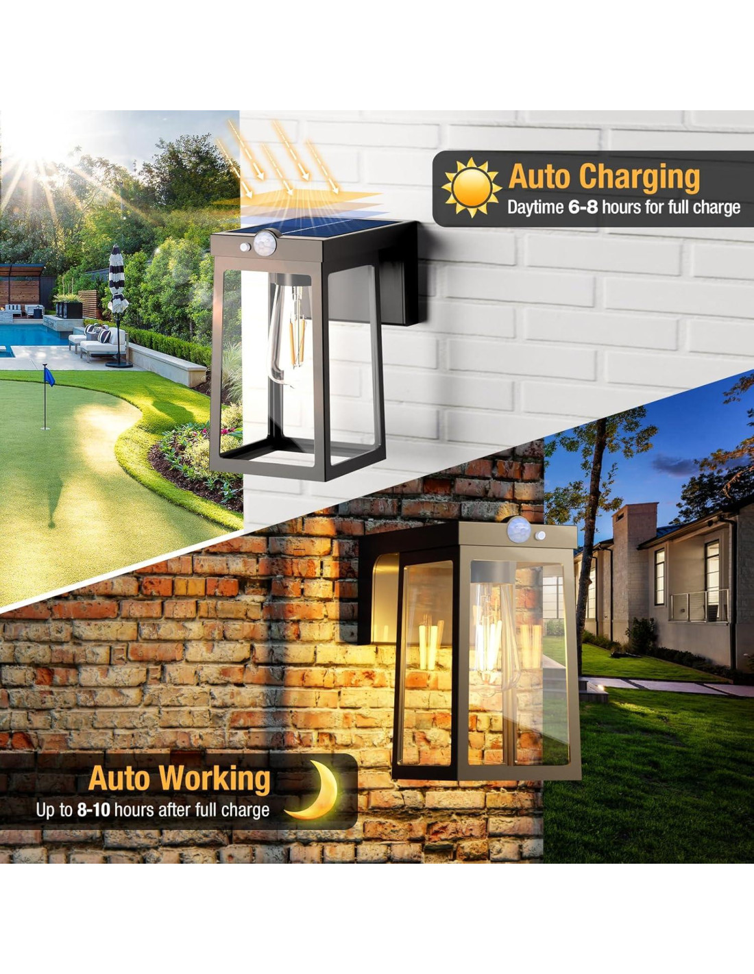 - [Amplia Aplicación y Diseño Retro] Esta luz solar para porche exterior también se puede usar en lugares sin cables, y solo toma unos minutos instalarla con éxito. El vidrio templado claro y el plástico de alta calidad hacen que esta luz de sensor de movimiento exterior se vea elegante y resistente. Perfecta para tu puerta principal, cerca, jardín, patio, porche, balcón, pasillo y más