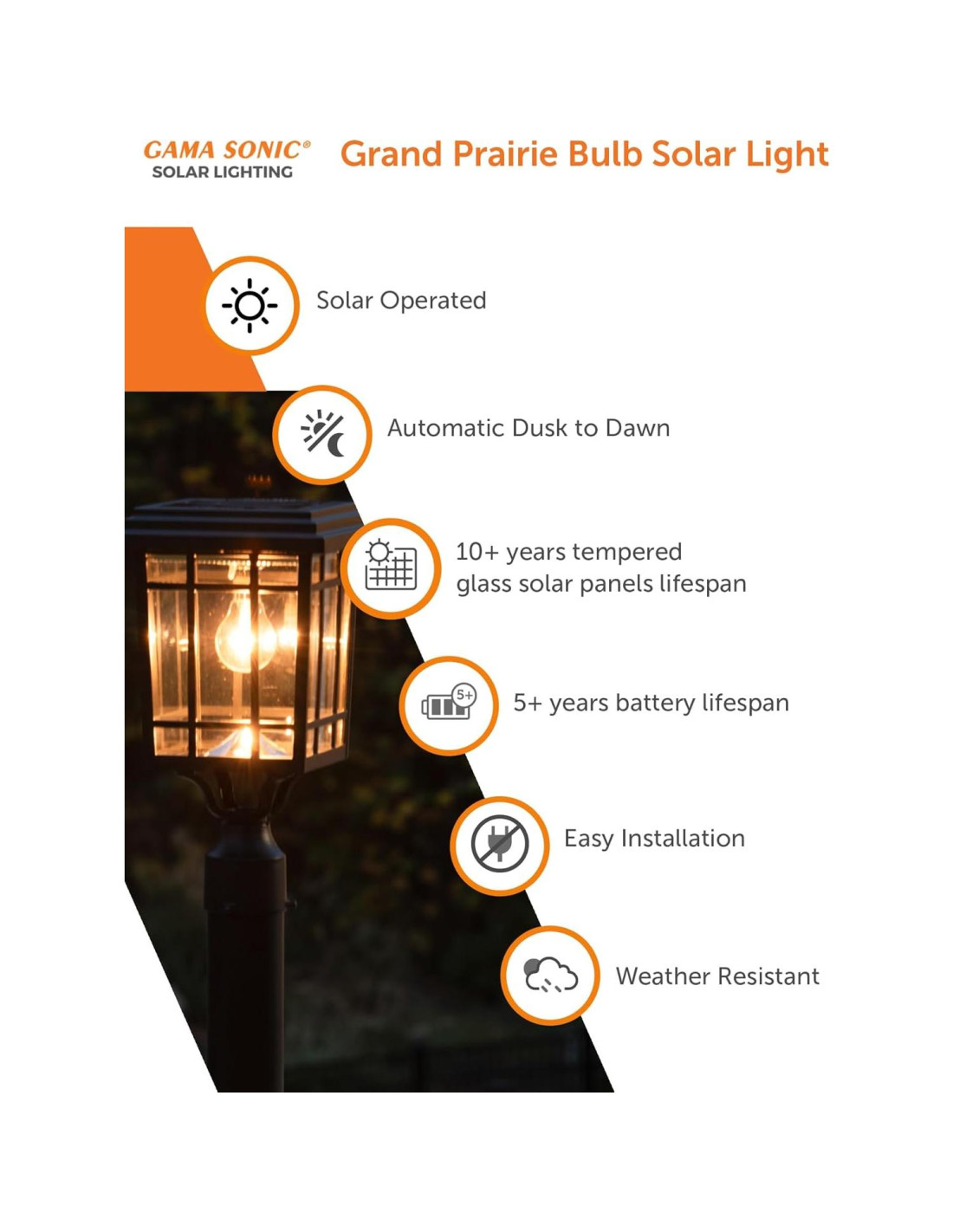 - SIN CABLEADO NI CONEXIONES COMPLICADAS. No se requiere cableado eléctrico para la instalación, lo que hace de esta lámpara solar exterior Gama Sonic la luz perfecta para instalar, ofreciendo una alternativa eficiente en costos y energía a la iluminación exterior a gas y eléctrica.