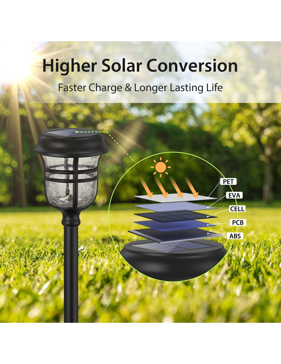 - Operación Solar de Alta Eficiencia - Equipadas con 2.56 paneles monocristalinos y batería de 1000mAh, estas luces solares para exteriores ofrecen un tiempo de funcionamiento de 6-8 horas. Las luces paisajísticas solares con clasificación de impermeabilidad IP65 soportan todas las condiciones climáticas con operación automática de anochecer a amanecer.