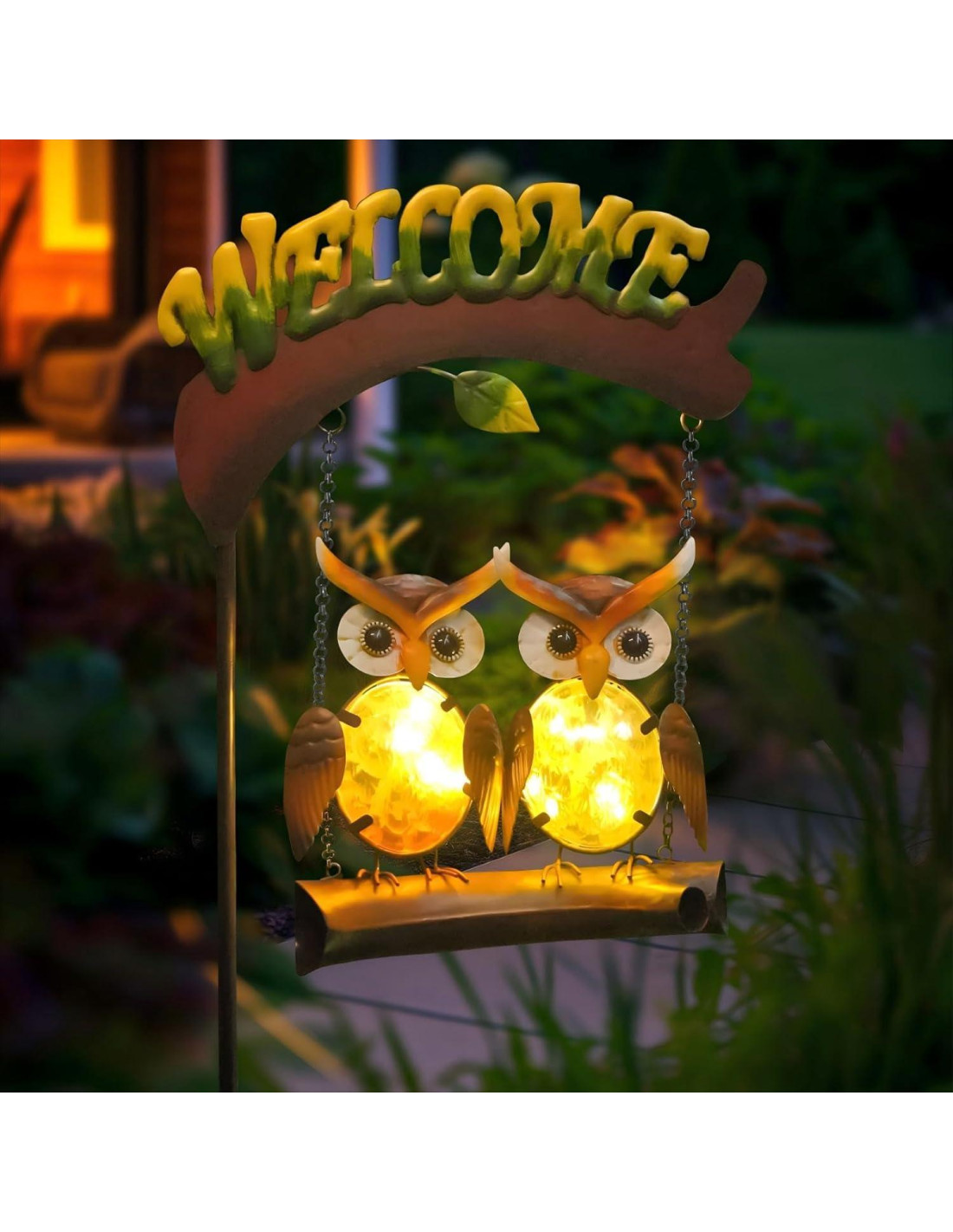 - Decoración de Jardín Encantadora-Diseño de hada único y original: el diseño de las lindas luces solares de búho con un patrón de vidrio único, las cabezas y alas están conectadas por un resorte que puede vibrar. La pareja de búhos de pie en el columpio con la palabra 'Bienvenida' y jugando, hace que tu jardín esté lleno de vitalidad y diversión