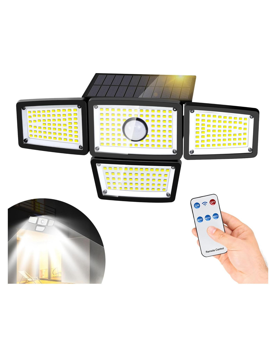 - AMPLIA COBERTURA: Personaliza el ángulo de iluminación con cuatro cabezas ajustables, luces exteriores con sensor de movimiento, proporcionando una amplia cobertura de 270 para eliminar puntos oscuros y mejorar la visibilidad. Lámpara solar de 4 cabezas, con capacidades de detección infrarroja que alcanzan de 3 a 5 metros, esta luz ofrece cobertura integral y adaptabilidad para todas tus necesidades de iluminación exterior.