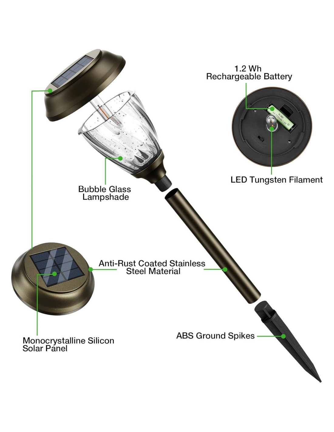 - Luces Solares de Jardín de Diseño de Lujo - Vidrio texturizado en burbujas (93% de transmitancia de luz) con recubrimiento nano que repele la suciedad - probado 96% más fácil de limpiar en comparación con el plástico. Patrones de luz estrellada de 360 a través de una lente paraboloide diseñada por CAD. Estas luces solares exteriores crean una atmósfera mágica sin amarillarse (99.6% de estabilidad UV después de 5 años).
