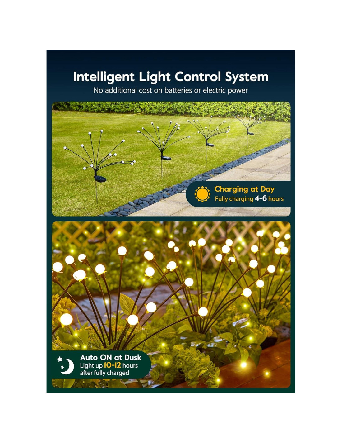 - Encendido/Apagado Automático: Las luces de jardín exteriores se encenderán automáticamente al anochecer y se apagarán al amanecer. No se requiere conexión de cable ni electricidad doméstica, solo coloca las luces de jardín de luciérnaga solares a la luz del sol, y no necesitas ajuste manual, se cargará durante el día y se encenderá automáticamente por la noche.