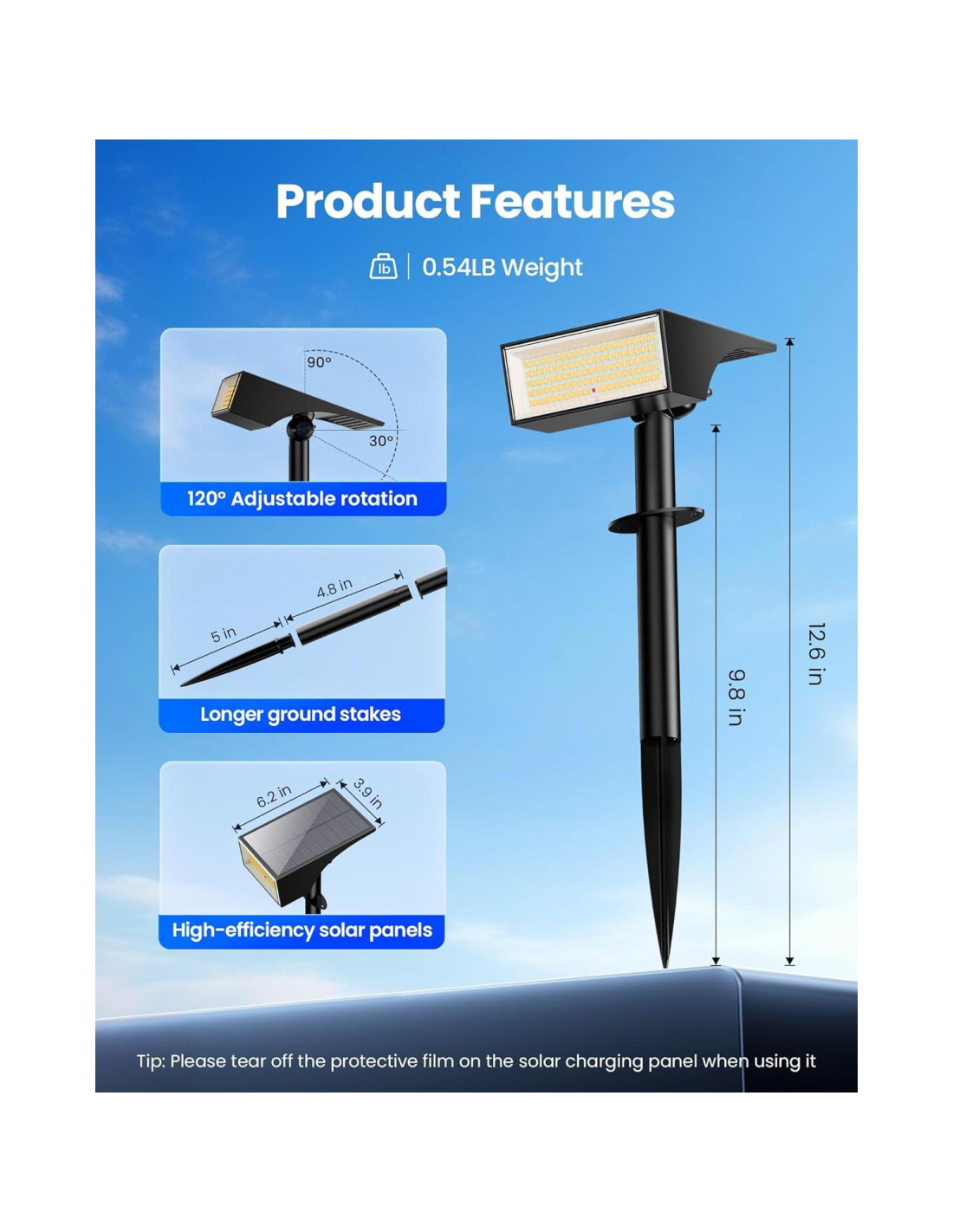 - Duraderas y de Fácil Instalación: Las luces solares tienen cabezales ajustables de 120 que soportan la inserción en el suelo y la instalación en la pared, funcionan bien entre -20C y 60C y en condiciones impermeables, a prueba de polvo, a prueba de calor y a prueba de heladas.