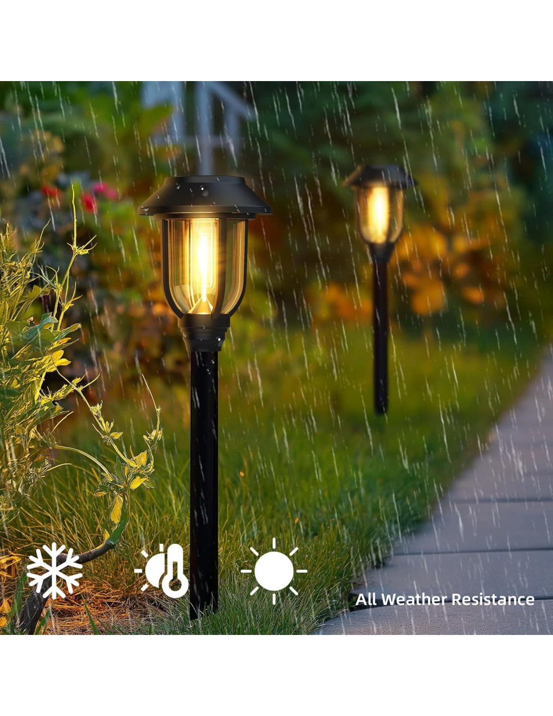 - Diseño Impermeable y Duradero: Estas luces solares están construidas con una clasificación de impermeabilidad, asegurando que puedan soportar condiciones climáticas adversas y seguir funcionando bajo la lluvia o el sol. Las estacas de ABS de alta resistencia soportan mascotas que muerden, proporcionando una iluminación duradera para sus espacios exteriores.