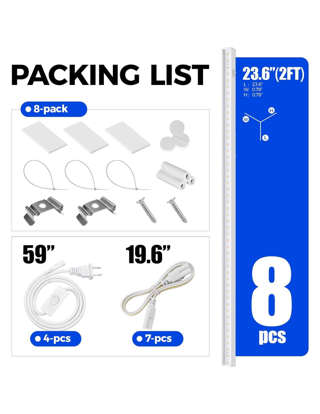 - Lo Que Obtienes - 8 x Luces de cultivo Barrina T5, 4 x Cables de alimentación con interruptor ON/OFF, 8 x Clips de instalación, 24 x Cintas de doble cara 3M, 24 x bridas, 7 x Cables de conexión (50.8 cm), 8 x Conectores pequeños