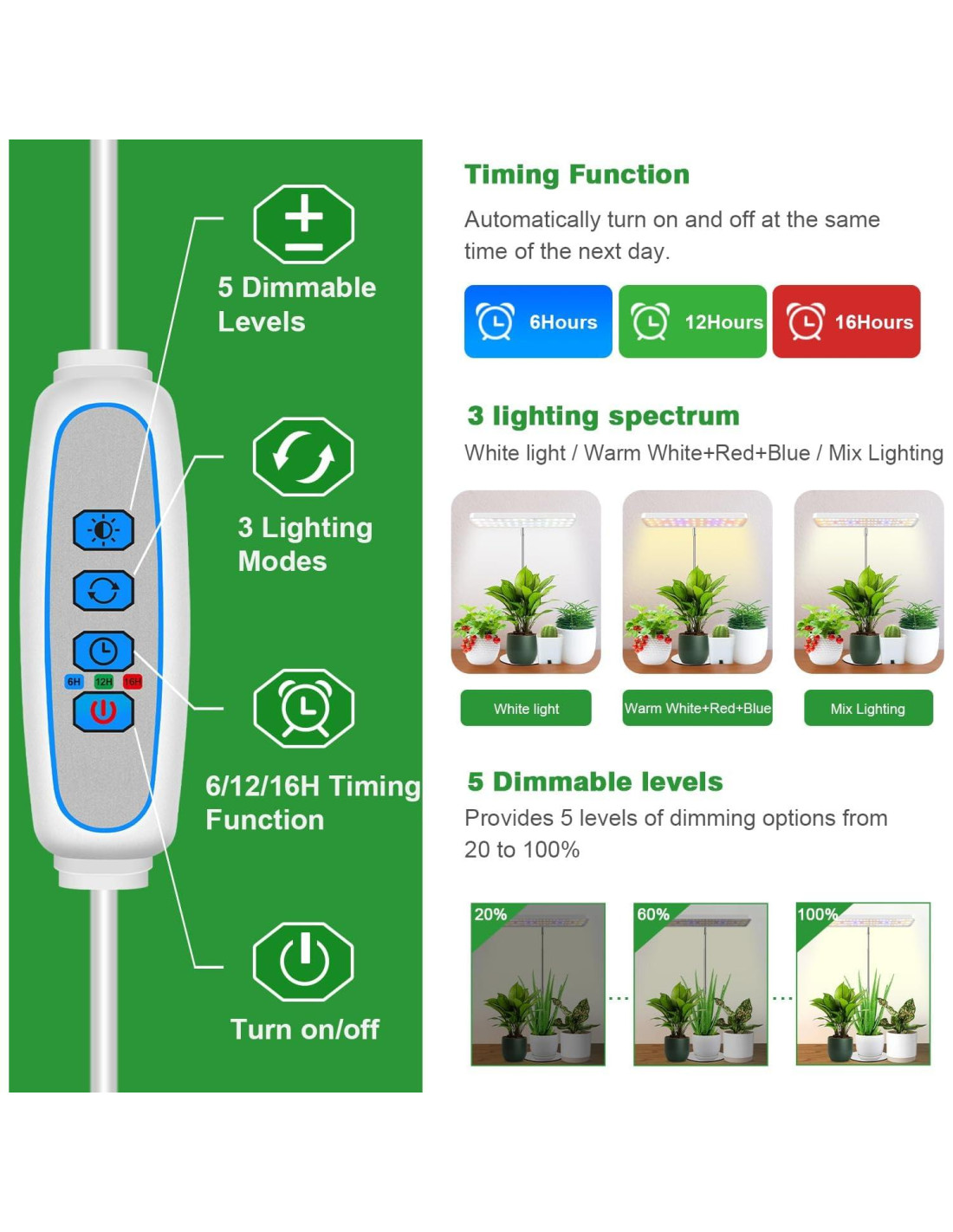 - Nuevo Controlador: Nuestras luces para plantas están equipadas con 5 niveles regulables del 20% al 100%, 3 espectros de iluminación 'blanco, blanco cálido y rojo y azul, luz mixta'. En particular, hemos mejorado el temporizador a 6H, 12H, 16H, lo que permite que las plantas reciban más tiempo de luz.
