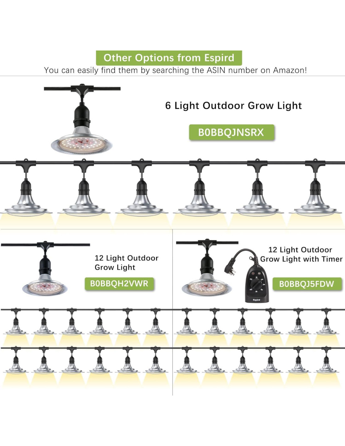- [Luz de Cultivo Certificada por UL con Temporizador] Las luces de cultivo exteriores Espird están certificadas por UL. En comparación con otras lámparas para plantas, el estricto proceso de certificación de UL significa que nuestro producto es mucho más seguro y garantizado. Espird ha mejorado el temporizador mecánico con una escala que muestra 24 horas en el dial. En comparación con el anterior temporizador de sensor de fotocélula, no será perturbado por la luz artificial, lo que lo hace más libre de usar.