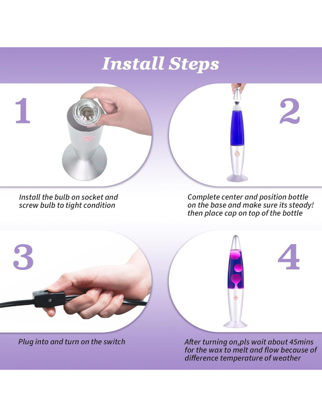 - [Escapar del Estrés y el Ruido] : Cambiando de color de un hipnotizante púrpura a blanco en la lámpara de ambiente, esto es un festín visual y emocional. Es muy fascinante y relajante ver el movimiento de la cera. Es bastante zen y pacífico, cuando miras la cera derretirse, los blobs de cera se mueven muy lentamente y transforman nuevas formas, parece que el tiempo se arrastra y también se vuelve muy lento. Te ayuda a escapar de tu TV, computadora, redes sociales, etc. para disfrutar de un rato de paz.