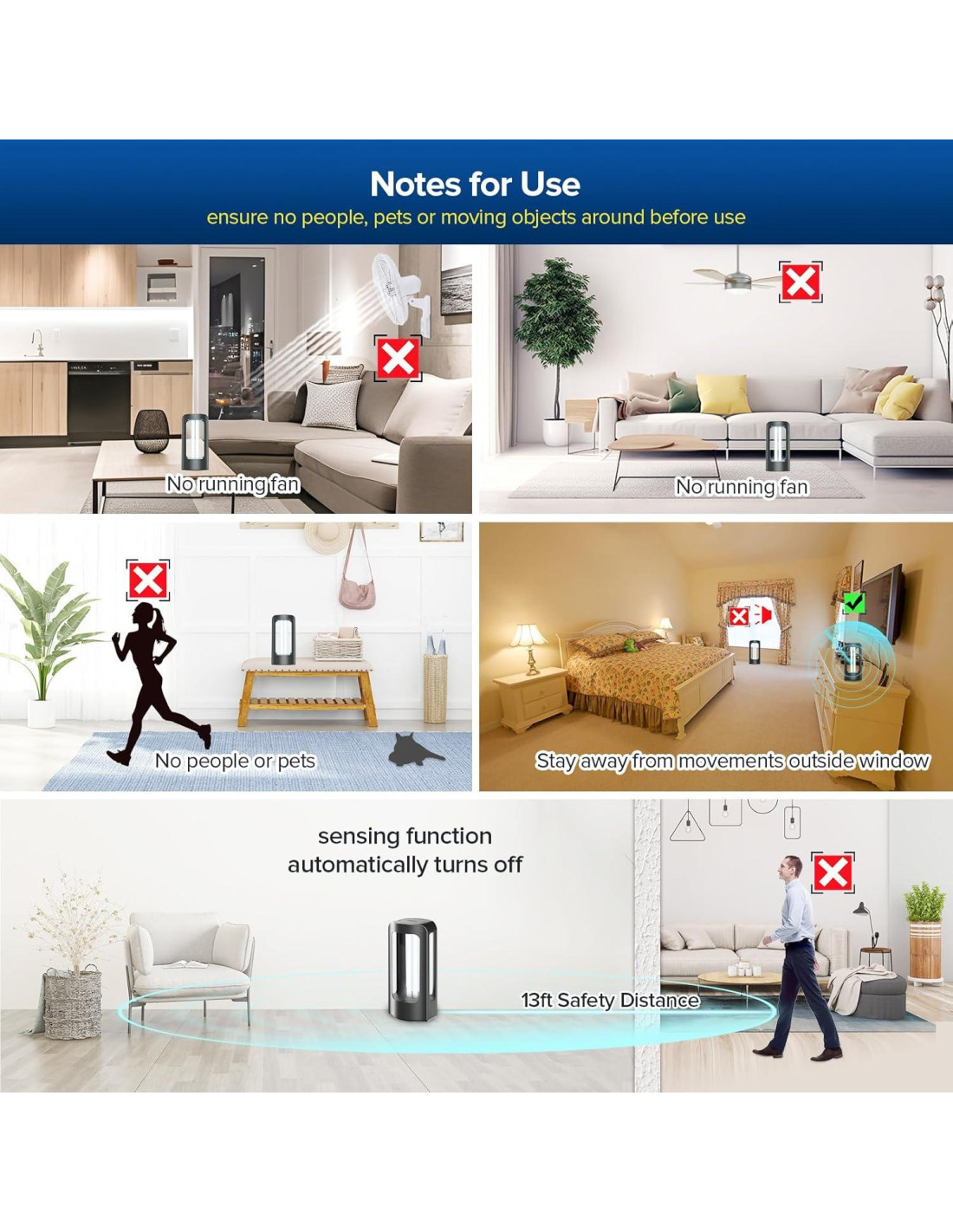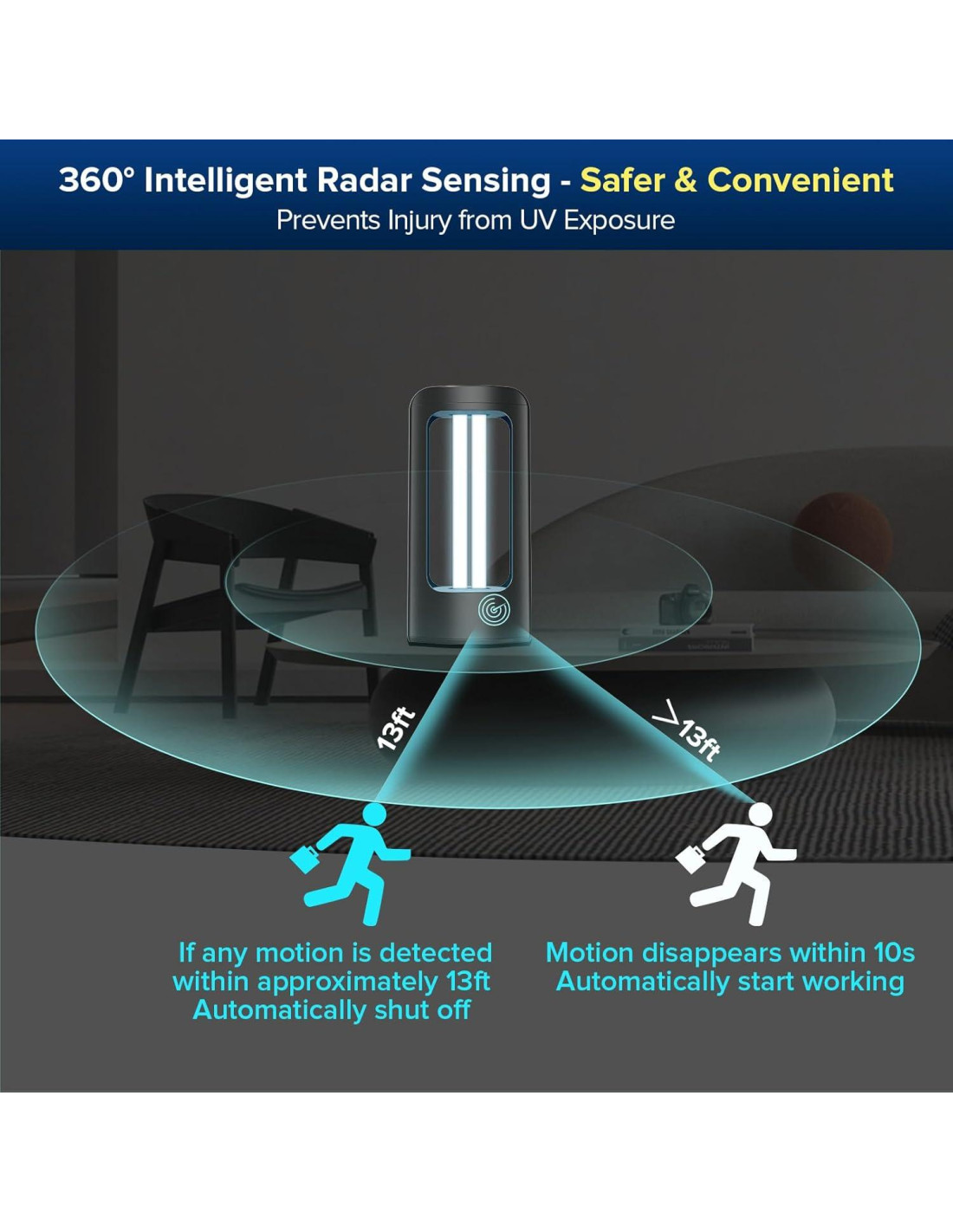 - SEGURO Y CÓMODO: Con diseño de detección de radar inteligente, cuando las personas o mascotas se acercan al rango seguro de 4m, el zumbador sonará y la luz se apagará automáticamente para prevenir daños por UV. Cuando el movimiento desaparece dentro de 10s, comenzará a funcionar automáticamente