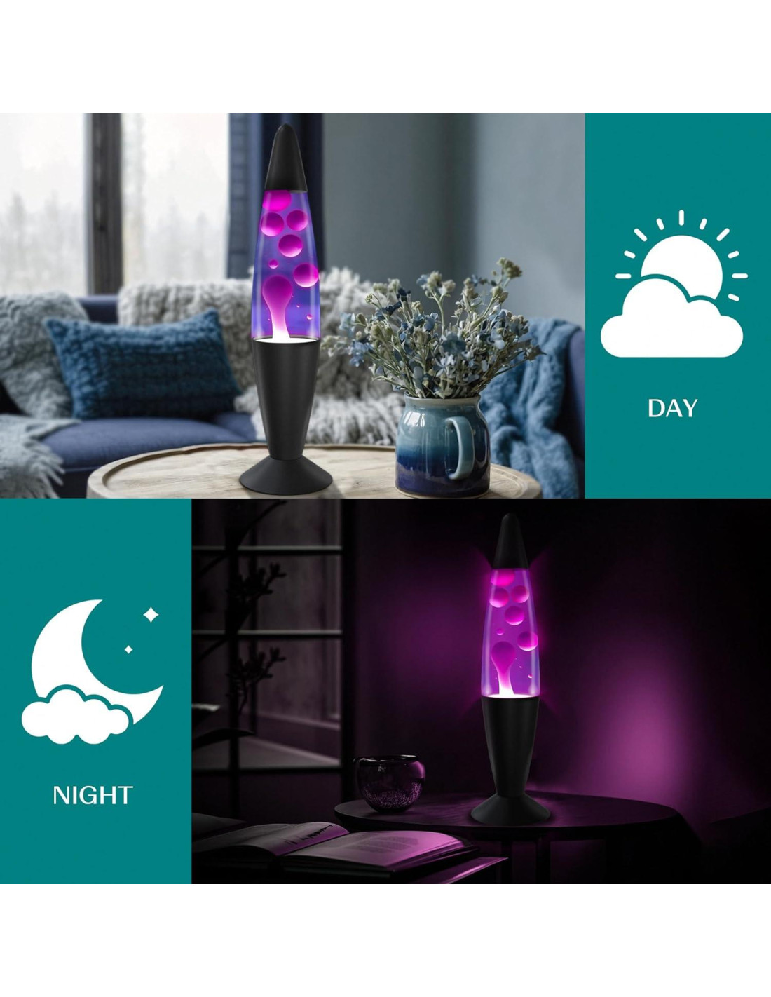- DISEÑO CLÁSICO DE BASE NEGRA: La elegante base negra de esta lámpara añade un toque moderno a su diseño inspirado en lo retro. Complementa cualquier decoración de habitación, proporcionando un elegante contraste con el vibrante movimiento de la cera y creando una pieza de declaración estilosa para tu espacio.