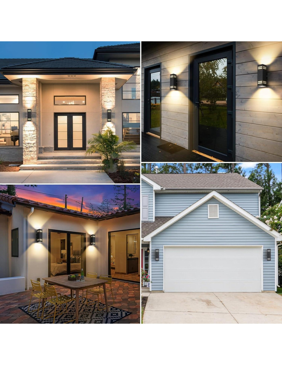 - ESTÉTICA MODERNA Y ELEGANTE - Con líneas rectangulares elegantes y un acabado negro mate, el accesorio de luz exterior mejora la apariencia de cualquier exterior. El diseño de iluminación arriba y abajo añade un toque contemporáneo, mientras que las cubiertas superior e inferior evitan que los insectos entren. Esta estética moderna hace que estos apliques exteriores sean una adición sofisticada a tu porche, patio, garaje o cualquier área exterior.
