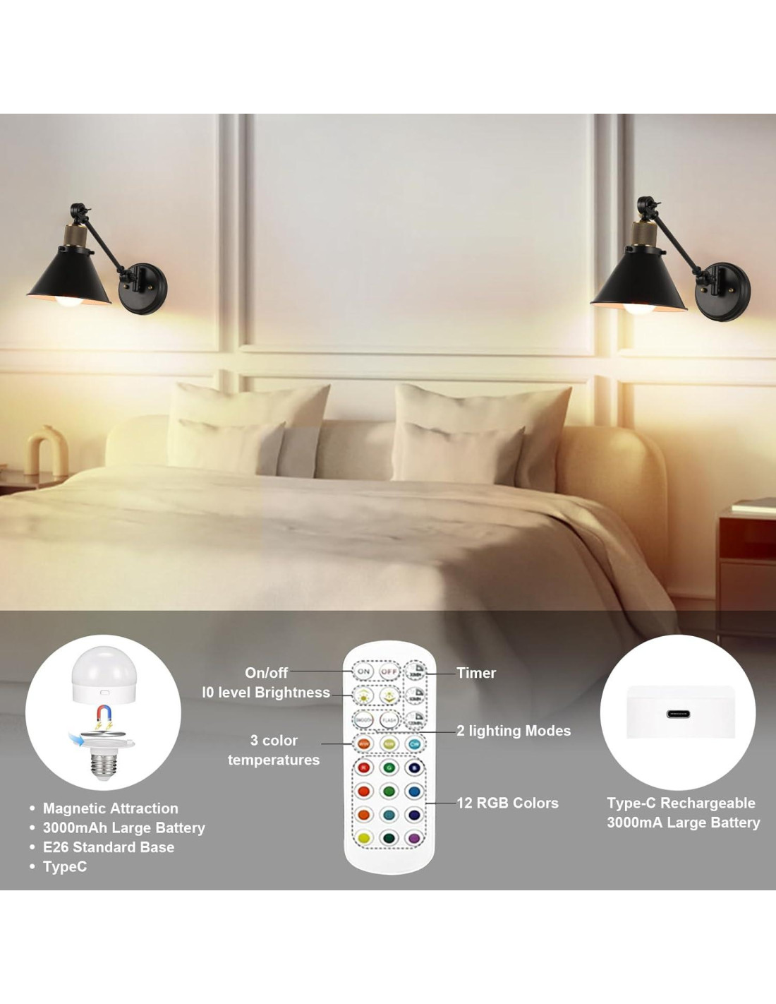 - Fácil de Instalar e Inalámbrico: No se requiere cableado; solo monta la luz de pared en la superficie de la pared con tornillos, luego instala la bombilla alimentada por batería incluida. El paquete incluye: 2 apliques de pared + 2 bombillas recargables + 2 controles remotos + 2 cables de carga Tipo-C + hardware de montaje + guía de instalación.