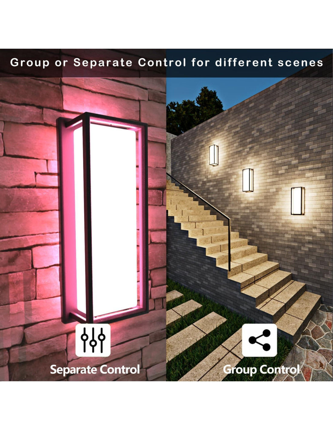 - Diseño Elegante - Con un diseño rectangular moderno y 2 formas de instalación que satisfacen tus necesidades para decoración exterior e interior, la moderna luz exterior RGB ofrece una iluminación única sin deslumbramiento hacia arriba y hacia abajo y en la cara frontal, mejorando la belleza y funcionalidad de cualquier espacio. Ideal para porche, puerta principal, balcón, patio trasero, garaje, patio, recinto de piscina o teatro. Aporta buena iluminación y atractivo visual a tu hogar.