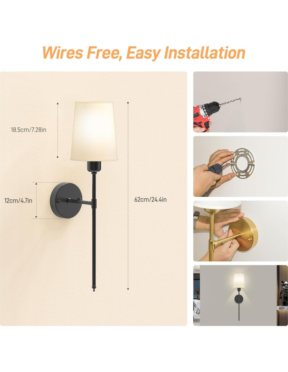 - [Juego de apliques de pared a batería de dos] - Cada aplique presenta un diseño moderno y elegante, con un marco de metal de alta calidad y una pantalla de tela blanca. Estas luces de pared a batería están equipadas con bombillas recargables y desmontables y puertos de carga USB. El cable USB tipo C incluido tarda de 3 a 4 horas en cargar completamente la bombilla, que luego funciona durante 20-48 horas.