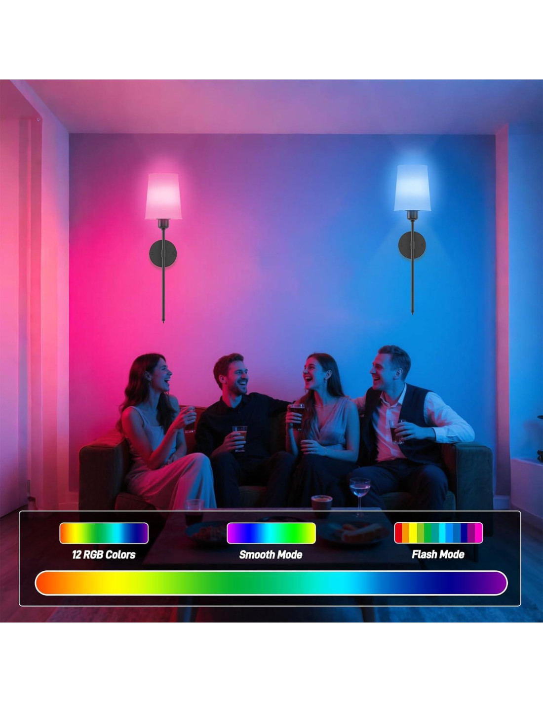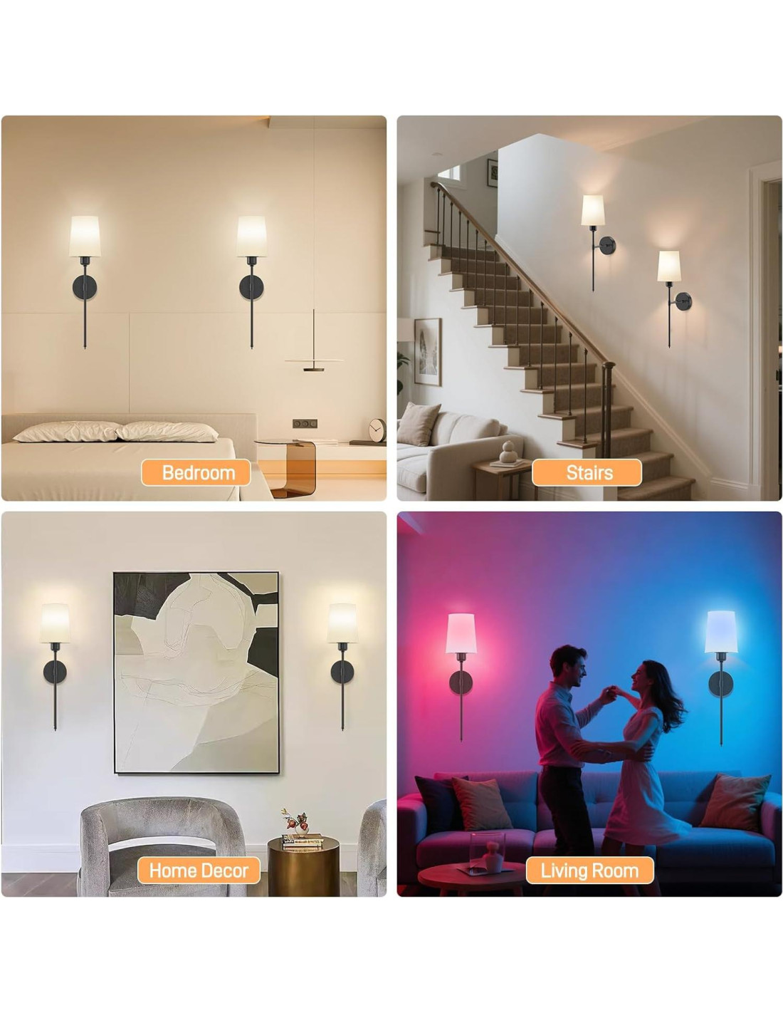 - [Regulable y personalizable en color] Personaliza tu experiencia de iluminación con temperaturas de color ajustables que van desde 3000K a 6500K y cuatro niveles de brillo (25%-100%), así como 12 colores RGB. Ya sea que necesites una iluminación cálida y acogedora o una iluminación brillante y energizante, nuestro juego de apliques de pared de 2 ofrece una amplia gama de opciones de iluminación.