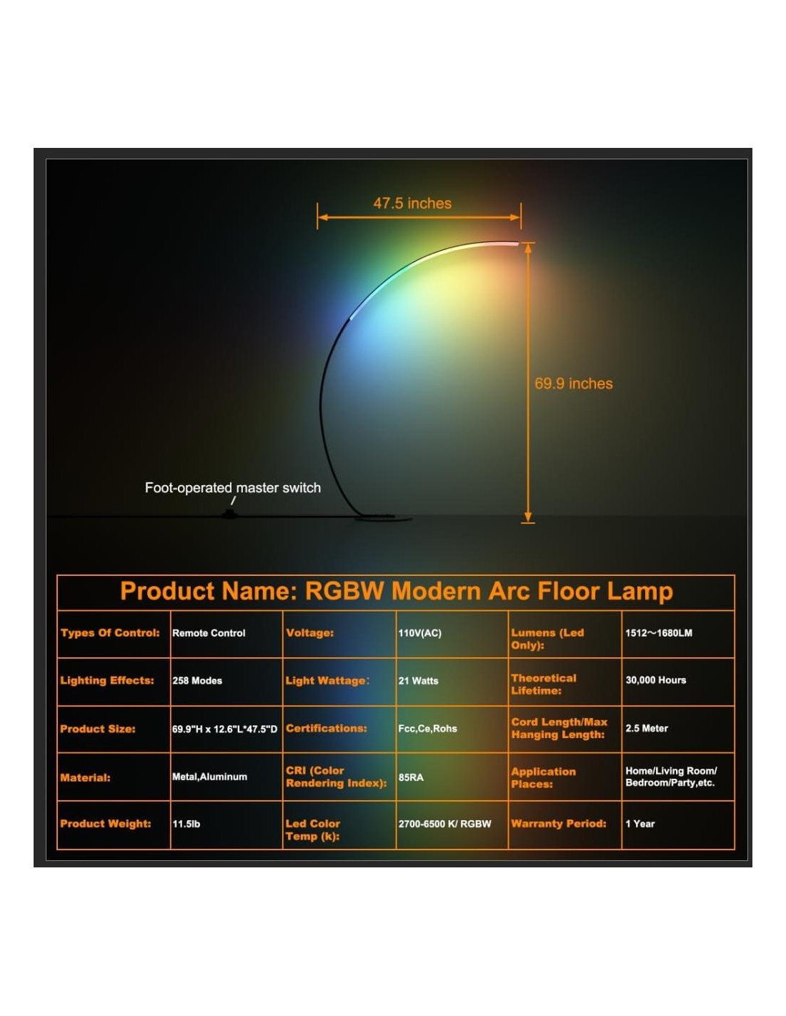 - VIVE UN ESPECTÁCULO DE LUZ GENIAL: Nuestras lámparas de arco para sala de estar tienen 258 modos de cambio de color de luz, puedes ajustar fácilmente su color y velocidad de cambio simplemente presionando ligeramente el control remoto, ¡disfruta de un genial espectáculo de luz con tu familia o pareja en tu tiempo libre!