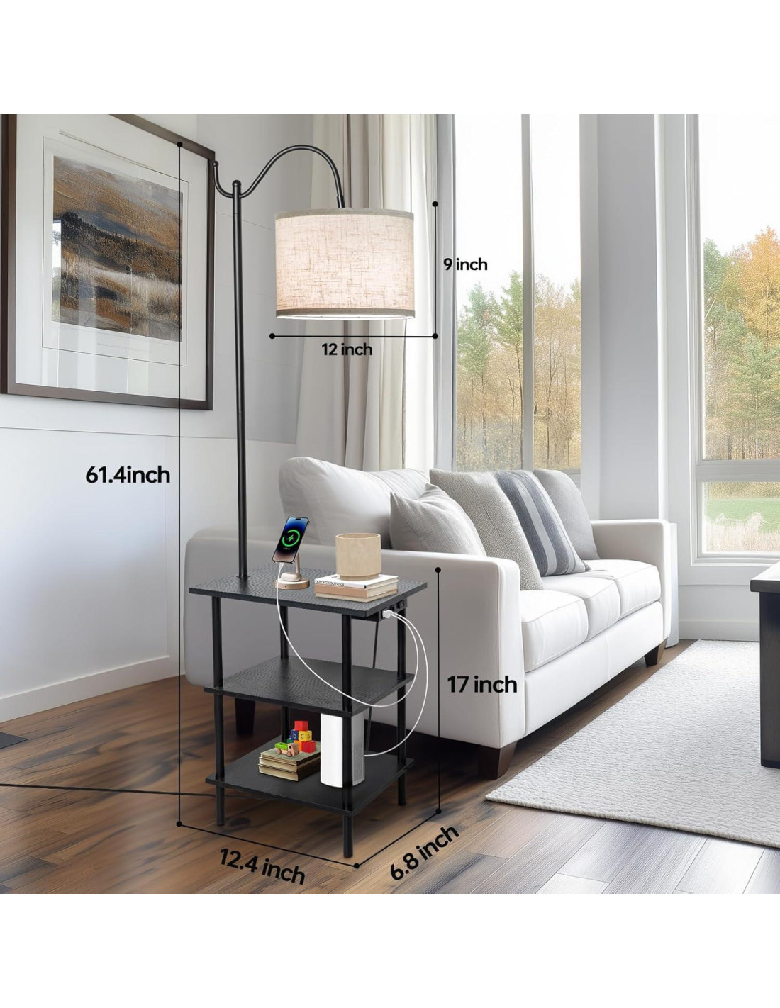 - Mesa Lateral con Estación de Carga: La lámpara de mesa viene con un puerto de carga USB de 5V/2A y un puerto de carga tipo C y un enchufe de CA. Cuando estás relajándote en el sofá o en la cama, puedes usar la mesa lateral con puerto USB y enchufe para cargar rápida y fácilmente tu teléfono móvil, auriculares Bluetooth o tableta mientras disfrutas del ambiente acogedor de la lámpara de pie de mesa lateral