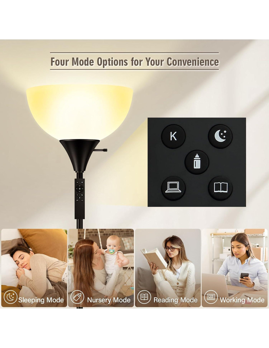 - Operación de Control Remoto Inteligente, Múltiples Modos para Cambio Fácil: Esta lámpara de pie moderna tiene dos opciones de control: control remoto e interruptor rotativo; el control remoto cuenta con una función de temporizador de 1 hora y cambio directo entre modo de sueño, modo de guardería, modo de lectura y modo de trabajo, estos modos hacen que esta lámpara de pie LED sea altamente práctica, que se puede seleccionar según diferentes necesidades; Es una buena opción si deseas una lámpara de pie que pueda ser conveniente y mejorar la atmósfera de iluminación.