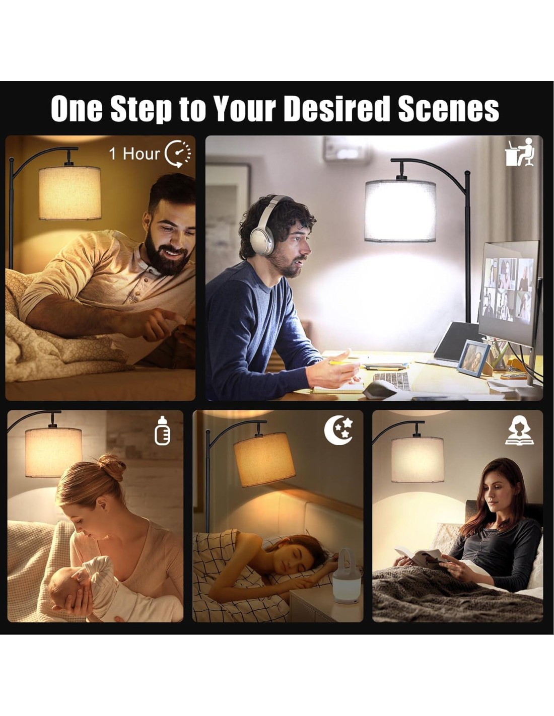 - Lámpara de Pie con Control Remoto-Timer y 4 Modos de Escena Temporizador: apaga automáticamente la lámpara para el dormitorio si te quedas dormido. Luz nocturna: una luz tenue de la lámpara para que los niños duerman tranquilos sin miedo a la oscuridad. Lectura: lámpara de pie que cuida los ojos te sumerge en el mundo de los libros. Trabajo: luz de pie enfocada crea alta eficiencia. Lactancia: una luz acogedora abraza a una madre lactante y a su bebé con amor.