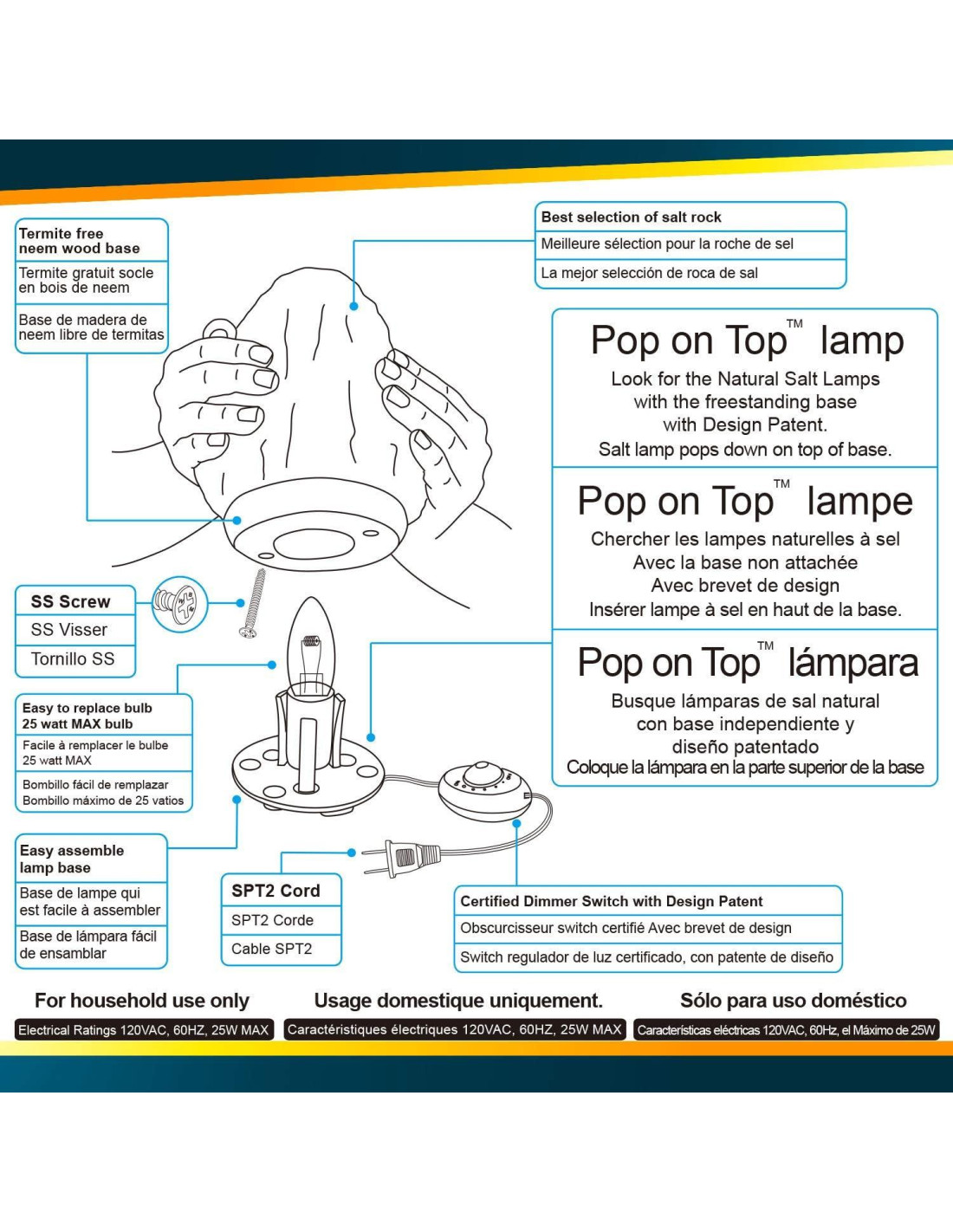 Las lámparas de sal blanca son uno de los accesorios para el hogar más populares y de moda en el mercado actual. Las lámparas tienen un diseño moderno y minimalista que se adapta a cualquier estilo o personalidad, y las lámparas de sal se pueden usar como una suave luz nocturna o para crear una atmósfera acogedora y relajante. Las lámparas de sal también tienen muchos beneficios para la salud, incluyendo la mejora de la calidad del aire, la reducción de los niveles de estrés y la ayuda con el insomnio. Nuestra lámpara de sal natural está hecha a mano con cristales de sal extraídos de las Montañas Himalayas en Pakistán. La lámpara de sal blanca es una excelente manera de purificar y limpiar el aire, y también proporciona una luz natural y relajante. Esta lámpara de sal blanca es la manera perfecta de mejorar la atmósfera de su hogar. La lámpara de sal del Himalaya viene con una bombilla y un cable certificado por ETL, y tiene un interruptor regulador patentado que le permite ajustar el brillo. La lámpara también está certificada de acuerdo con los estándares UL, por lo que puede estar seguro de que la lámpara es segura. Esta lámpara de sal blanca es la adición perfecta a cualquier habitación. La lámpara también ayuda a mejorar la calidad del aire, proporcionando alivio de alergias, asma y otros problemas respiratorios. Caja de regalo especialmente diseñada para cada cristal, las lámparas de sal blanca son un regalo considerado para sus seres queridos en cada ocasión especial como Halloween, Día de Acción de Gracias, Cyber Monday, Black Friday, Navidad y Nochevieja. Nuestra lámpara de sal es la elección perfecta para sus seres queridos con su calidad superior para alegrar su estado de ánimo y crear una atmósfera más romántica para su habitación. Una lámpara de sal blanca es una forma natural de mejorar la calidad del aire y crear una atmósfera relajante. La luz cálida y suave de una lámpara de sal es reconfortante, y los iones negativos emitidos pueden ayudar a aumentar la energía y la concentración. La lámpara de sal viene con una bombilla de 15 vatios, un interruptor regulador patentado único y un cable eléctrico de 1.8 metros. Cada componente está hecho de acuerdo con los estándares de ETL, incluyendo la roca de sal en sí. ¿QUÉ HAY EN LA CAJA? 2 X Bombilla de 15 vatios 1 X Lámpara de sal del Himalaya con Interruptor Regulador. 1 X Manual del Usuario de la lámpara de sal.