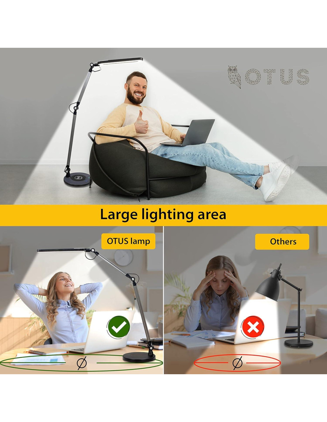 Tenemos una para ti: calidad superior con una larga vida útil, diseño elegante y atemporal, con muchas características útiles para la vida cotidiana como diferentes configuraciones de color y brillo, función de estación de carga inalámbrica, una de las opciones de regalos de alta gama. El diseño de la Lámpara de Escritorio Alta OTUS con un largo Brazo de Aluminio y pantalla ajustable proporciona la luz adecuada desde cualquier posición y ilumina todo el escritorio del arquitecto o una gran superficie de trabajo. Una pantalla larga proporciona una cobertura de iluminación más amplia que las lámparas con una pantalla redonda. 3 modos de color para cualquier actividad con configuraciones de brillo regulables sin escalas te dan un rango masivo de brillante a tenue y son perfectas para leer, trabajar en la oficina, relajarse, dibujar u otras tareas. LED de alta calidad emite una luz natural y suave como la luz del sol y restaura los verdaderos colores de los objetos (importante para pintar y crear). Luz brillante y suave no cansa tus ojos incluso mientras trabajas durante mucho tiempo. La lámpara de escritorio recuerda tus configuraciones de luz de la última vez que la usaste. Simplemente coloca y listo. Es así de simple. Olvídate de estar buscando cables y adaptadores cuando necesites energía. La lámpara de escritorio OTUS con cargador inalámbrico puede cargar rápidamente cualquier dispositivo que soporte carga inalámbrica (smartphone, auriculares, reloj). Un cargador puede suministrar energía a muchos de tus dispositivos favoritos. Los AirPods deben cargarse con un estuche de carga inalámbrica encendido, y más. Antes de que te des cuenta, tu cargador inalámbrico se convertirá en una parte integrada de tu rutina diaria. Ya sea que tengas un minuto o una hora, simplemente coloca tu teléfono en un cargador inalámbrico para mantener tu batería en esa zona óptima de 50-80% de energía. Inserta la lámpara profundamente en la base. Si la lámpara no funciona, vuelve a ensamblar la lámpara y la base.