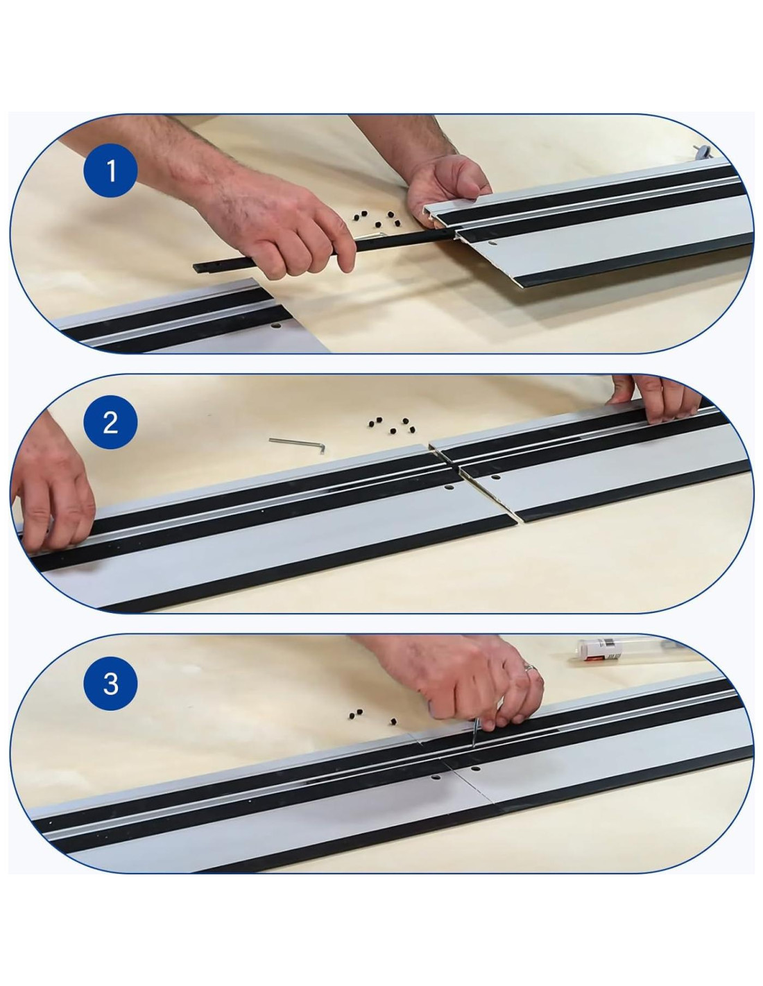 - Los accesorios del conector de sierra de carriles incluyen dos conectores de riel, una herramienta de montaje llave hexagonal y 4 tornillos Allen para asegurar un corte recto perfecto cada vez.